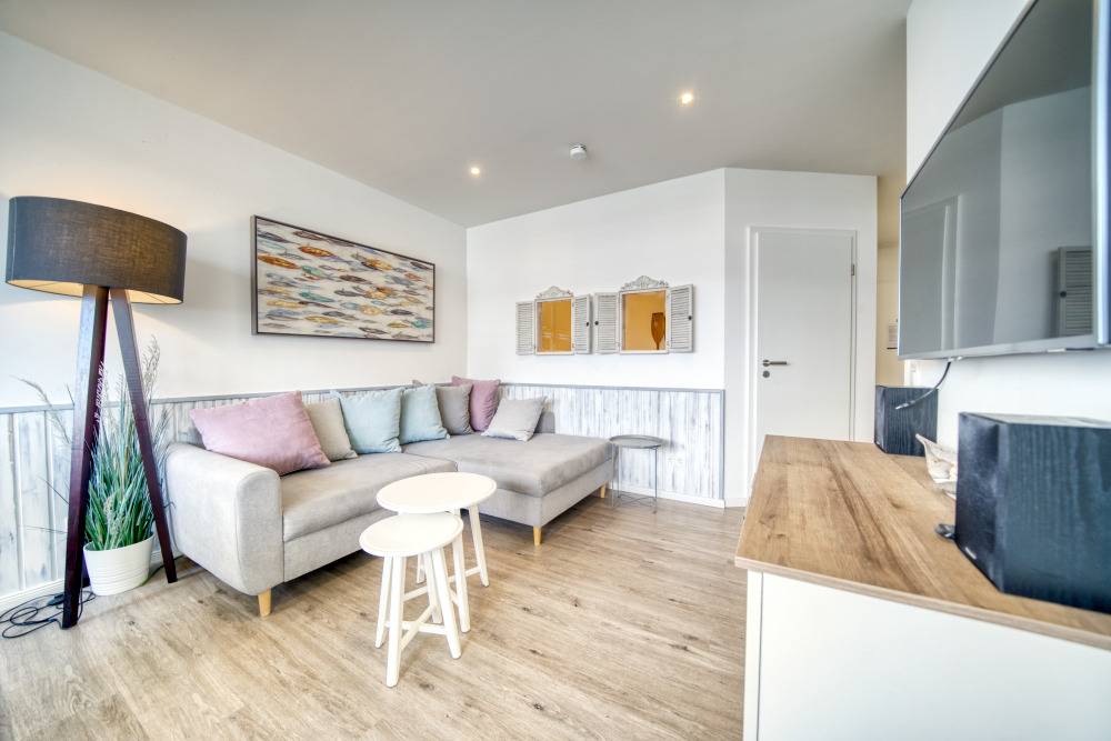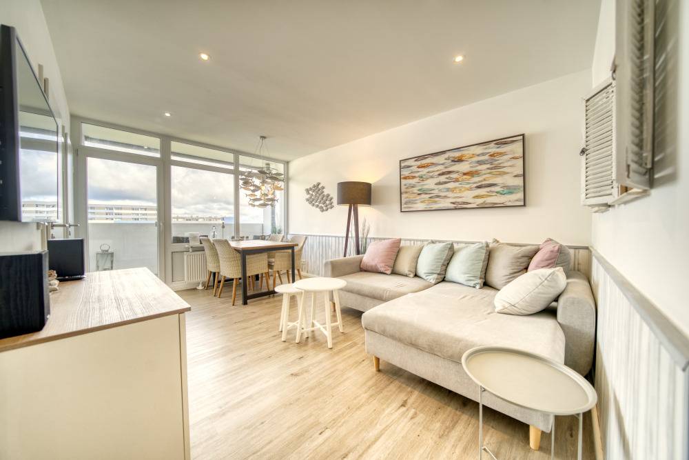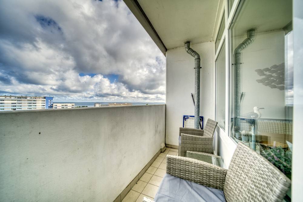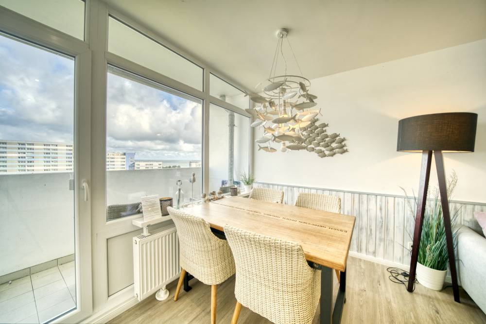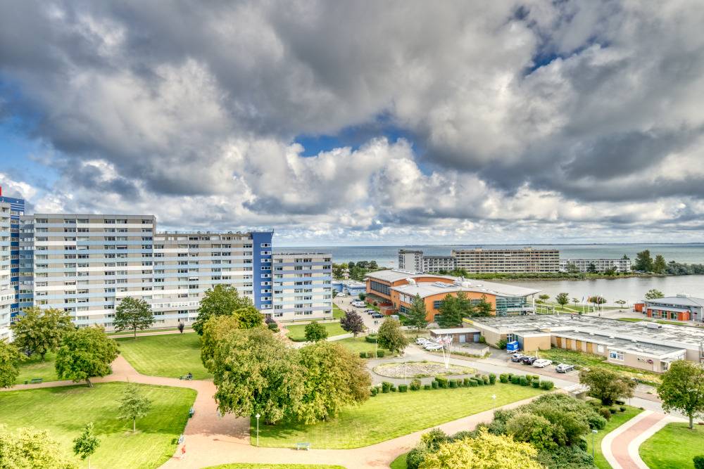 Die komfortable 45 m² große Ferienwohnung im Haus N, 9. Etage, bietet Platz für bis zu 5 Personen. Der Balkon mit Blick über den Innenhof auf Binnensee und Ostsee lädt zum Entspannen ein. Das Wohnzimmer verfügt über Schlafcouch, Esstisch und Smart-TV. Ein Schlafzimmer mit Doppelbett und eigenem TV sowie ein Kinderzimmer mit Etagenbett und TV eignen sich ideal für Familien. Die Küche ist ausgestattet mit Ceranherd, Backofen, Kühlschrank mit Gefrierfach, Geschirrspüler, Filterkaffeemaschine, Toaster und Wasserkocher. Das Bad bietet Dusche, WC und Handtuchtrockner.