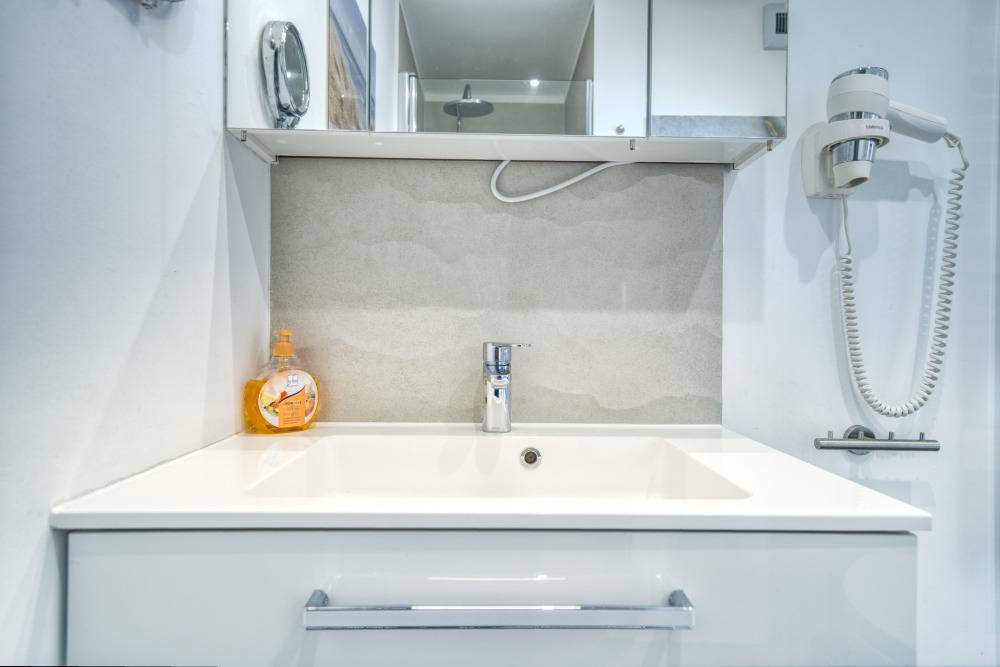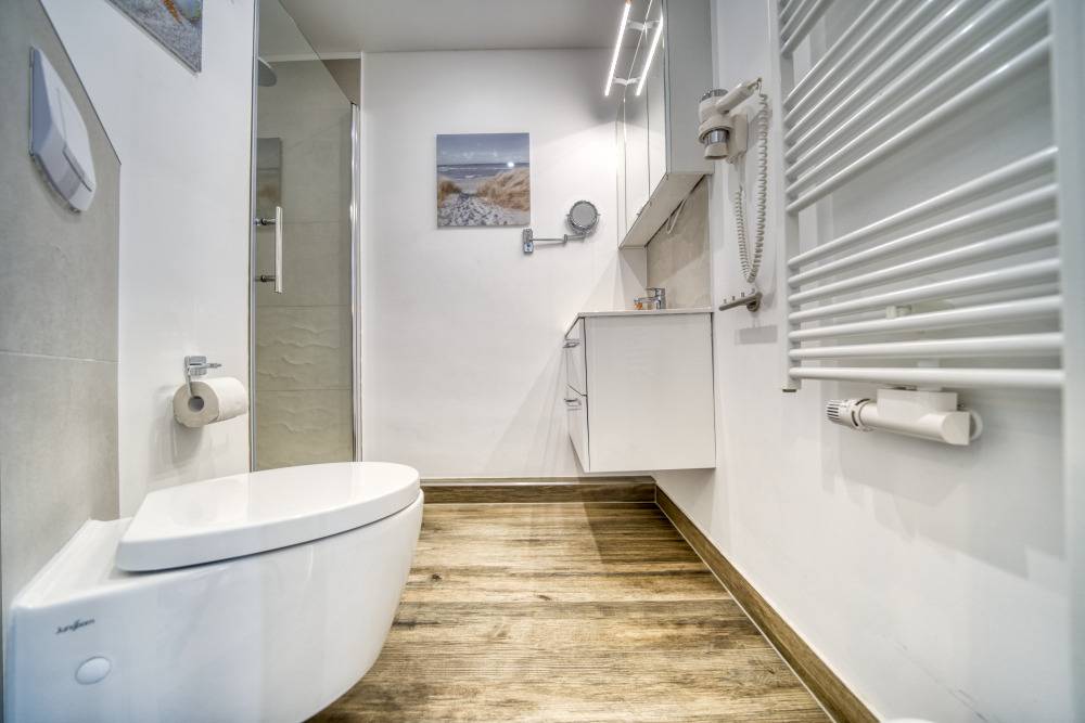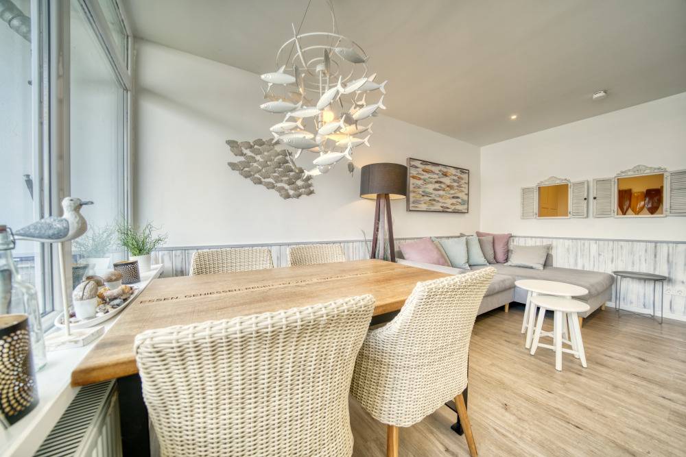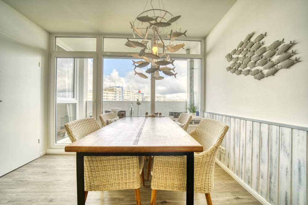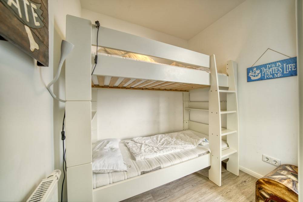 Die komfortable 45 m² große Ferienwohnung im Haus N, 9. Etage, bietet Platz für bis zu 5 Personen. Der Balkon mit Blick über den Innenhof auf Binnensee und Ostsee lädt zum Entspannen ein. Das Wohnzimmer verfügt über Schlafcouch, Esstisch und Smart-TV. Ein Schlafzimmer mit Doppelbett und eigenem TV sowie ein Kinderzimmer mit Etagenbett und TV eignen sich ideal für Familien. Die Küche ist ausgestattet mit Ceranherd, Backofen, Kühlschrank mit Gefrierfach, Geschirrspüler, Filterkaffeemaschine, Toaster und Wasserkocher. Das Bad bietet Dusche, WC und Handtuchtrockner.