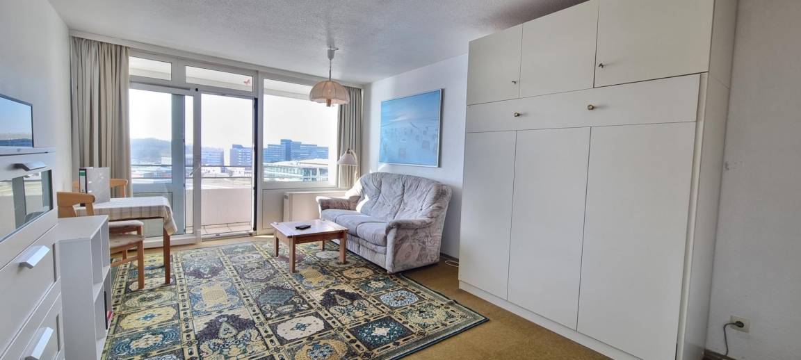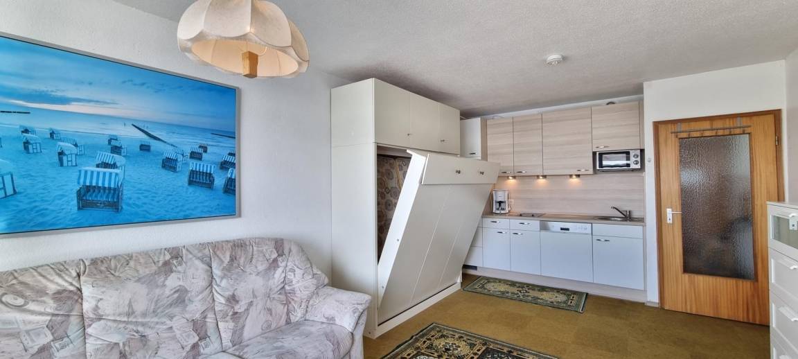 Das ca. 30 m² große Studio bietet einen freundlich gestalteten Wohn-Schlafraum mit einem komfortablen Schrankklappbett und integrierter Küchenzeile. Die clevere Raumaufteilung sorgt für ein offenes Wohngefühl auf kompaktem Raum.
