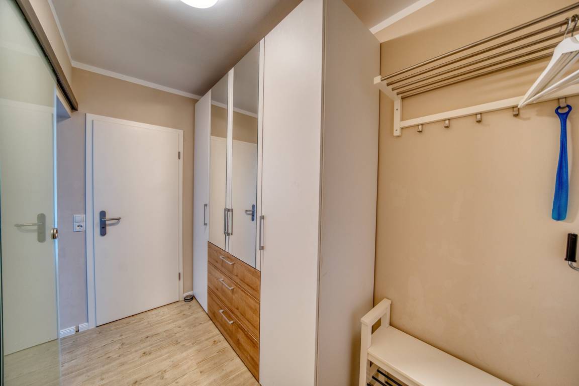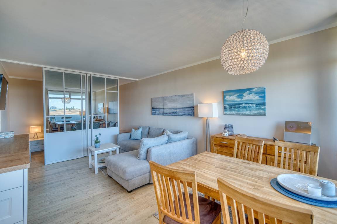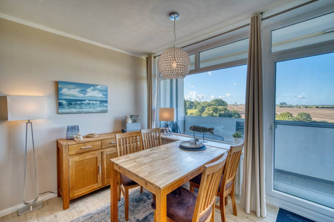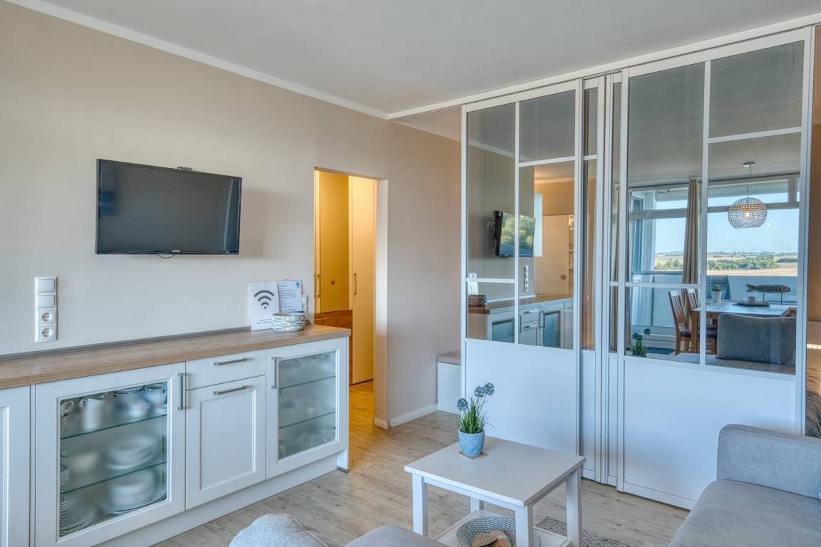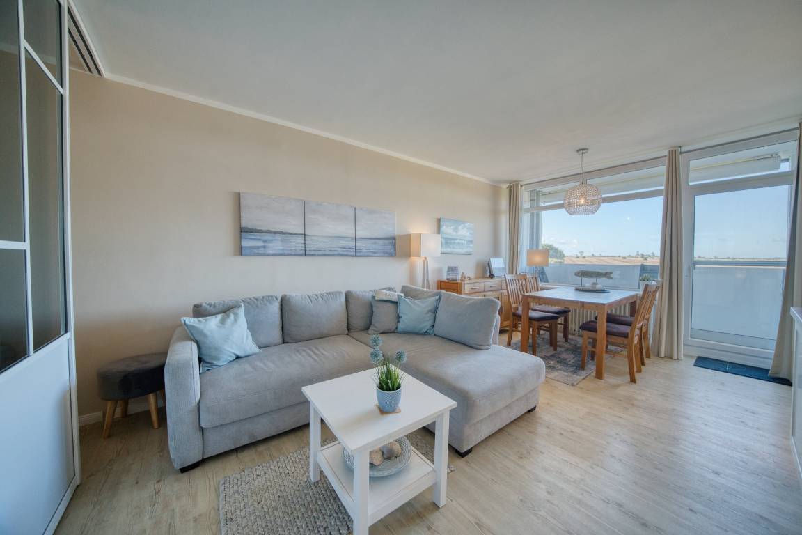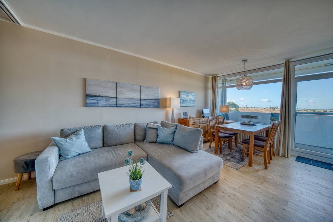Willkommen in dieser charmanten Ferienwohnung im Ferienpark Heiligenhafen, Haus L, 5. Etage. Die 45 m² große Wohnung bietet Platz für bis zu 4 Personen und überzeugt durch eine durchdachte Raumaufteilung und ruhige Lage mit Blick auf die Grünwiesen.