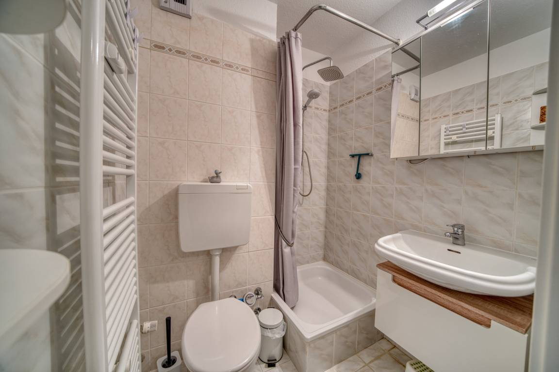 Badezimmer mit Dusche, WC und Handtuchtrockner