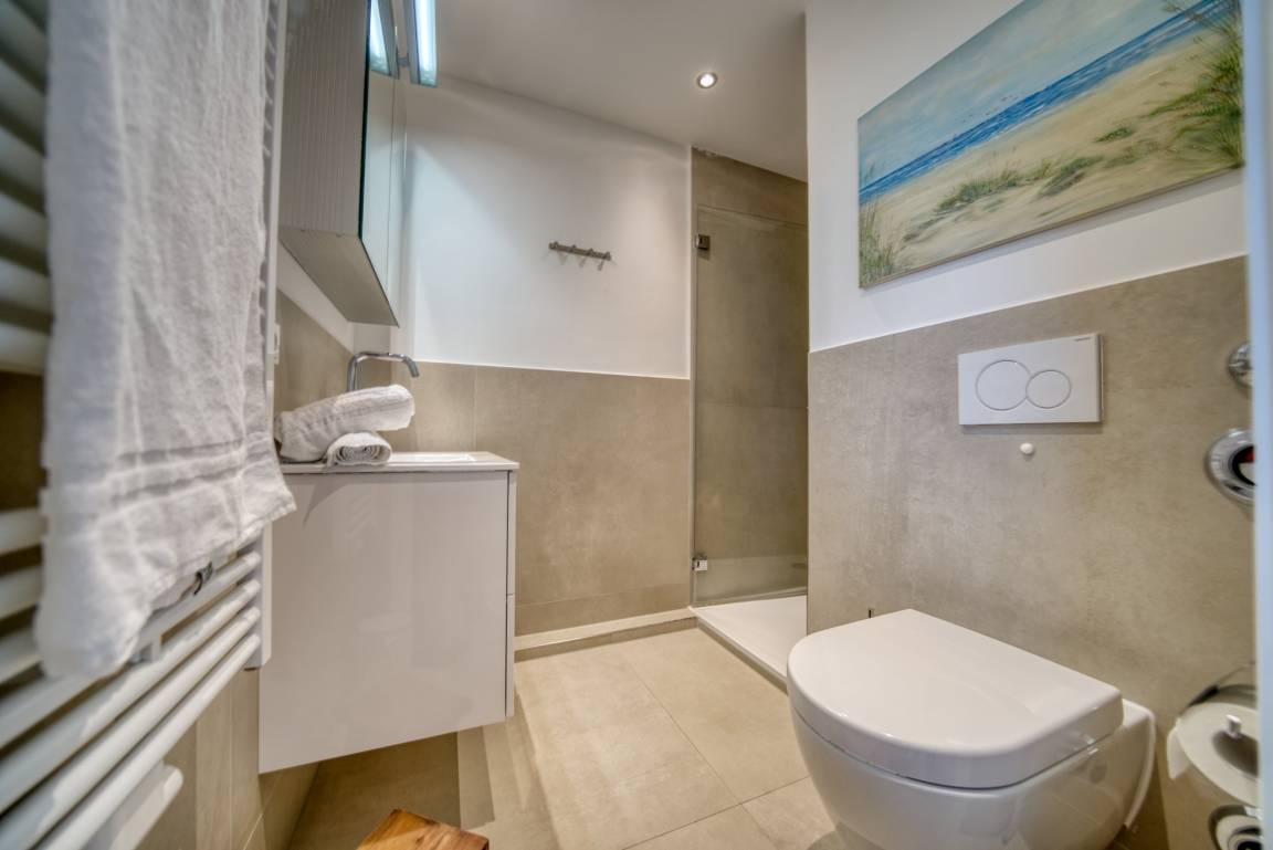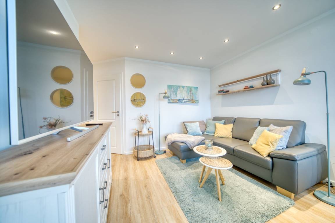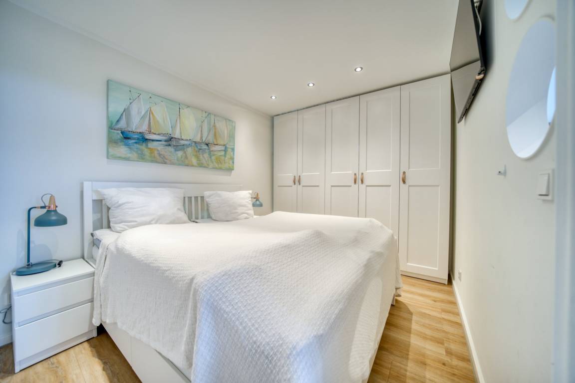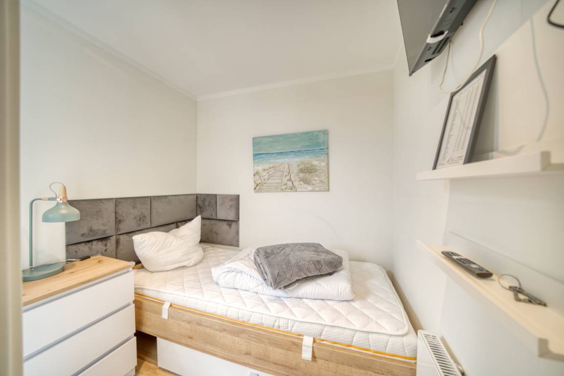 Die Wohnung verfügt über ein Schlafzimmer mit Doppelbett und TV, ein Kinderzimmer mit Einzelbett und TV, sowie einen offenen Wohnbereich mit Ecksofa, Essbereich und Flachbild-TV. Die Einbauküche ist mit Ceranherd, Backofen, Geschirrspüler, Kühlschrank, Mikrowelle, Kaffeemaschine und Wasserkocher ausgestattet. Modernes Bad mit Dusche, Vinylboden, WLAN, Fahrstuhl, abschließbare Fahrradräume, Nichtraucherwohnung, keine Haustiere. Strand ca. 300 m, kostenfreier Parkplatz direkt hinter dem Ferienpark.
