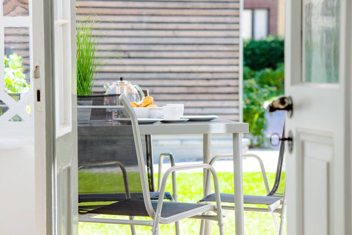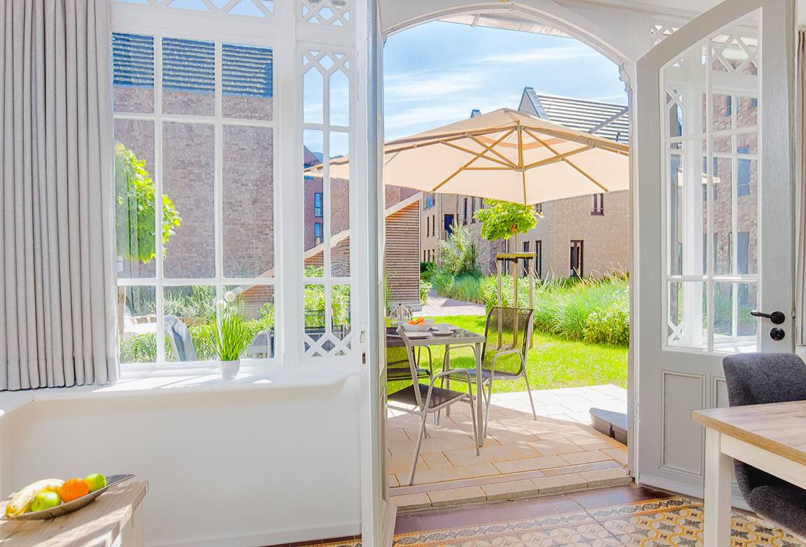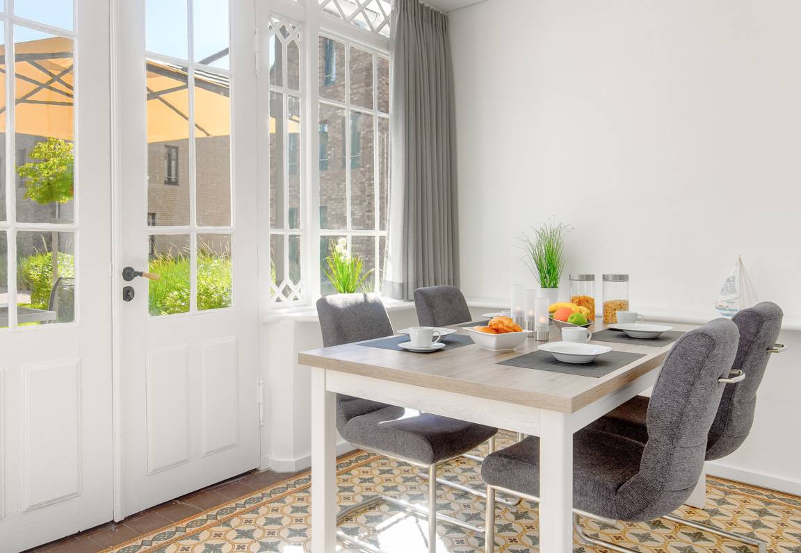Die voll ausgestattete Küche ist in den Wohnbereich integriert und bietet alle Annehmlichkeiten für Ihre kulinarischen Bedürfnisse. Der angrenzende, großzügige Essbereich im Wintergarten verleiht Ihren Mahlzeiten mit seinen historischen Elementen eine besondere Atmosphäre. Eine möblierte Terrasse mit Sonnenschirm lädt zum Verweilen im Freien ein und ermöglicht Ihnen entspannte Grillabende unter freiem Himmel.