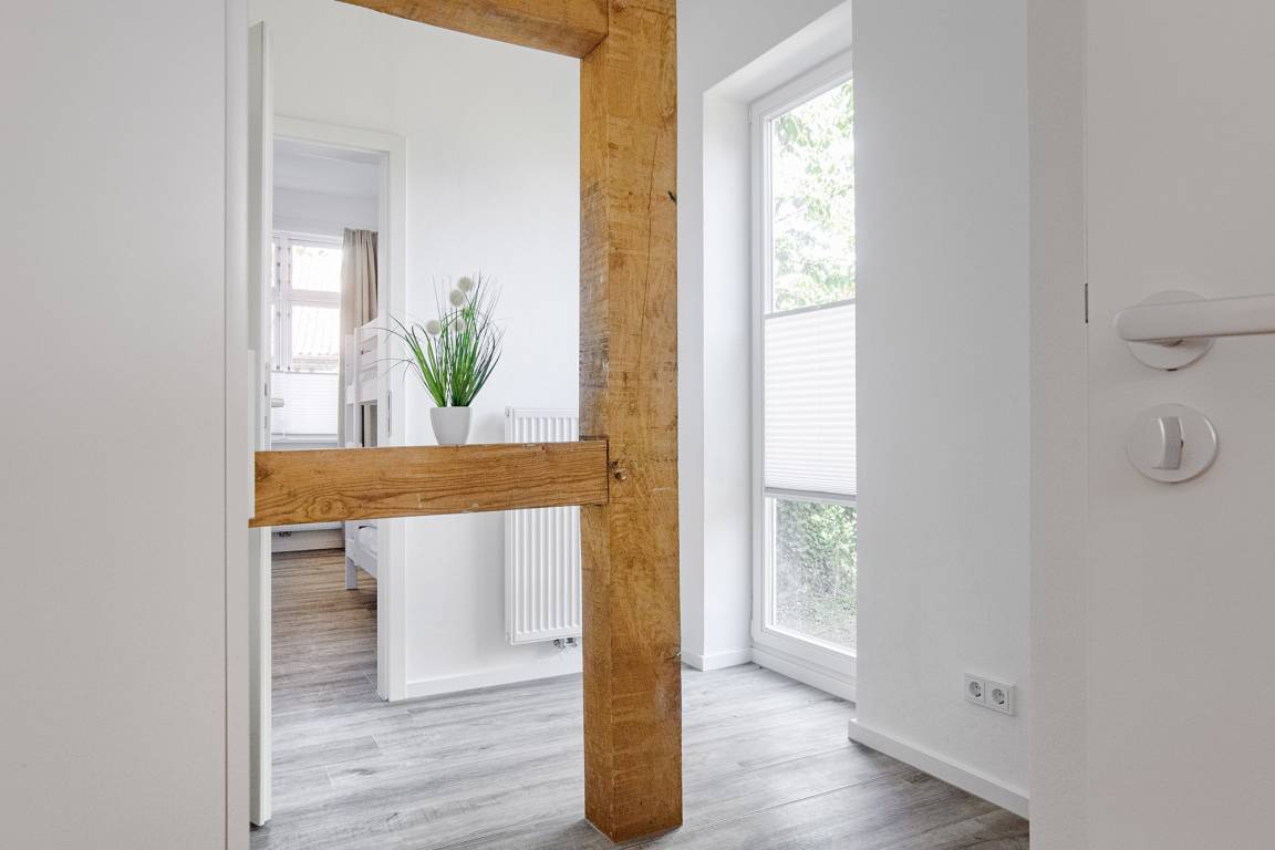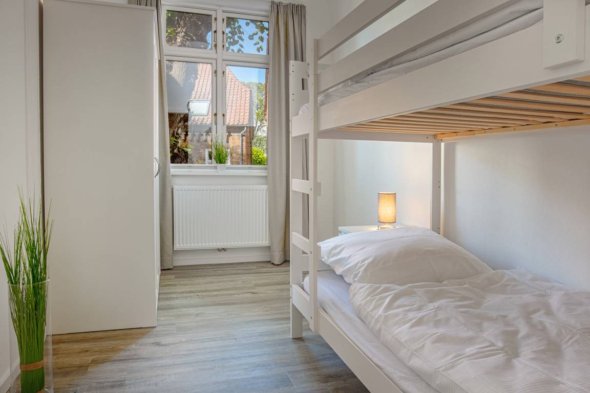 Der offen gestaltete Wohnbereich lädt mit einer gemütlichen Couch, Smart-TV und WLAN zum Entspannen ein. Große Fenster und der angrenzende Wintergarten sorgen für eine helle, freundliche Atmosphäre und bieten einen wunderschönen Blick in das malerische Fischerdorf Heiligenhafen. Die Ferienwohnung eignet sich besonders für Familien, da sie über zwei Schlafzimmer verfügt: eines mit einem komfortablen Doppel-Boxspringbett (180x200 cm) und ein weiteres mit einem praktischen Etagenbett (je 90x200 cm). Für erholsamen Schlaf und ausreichend Privatsphäre sorgen blickdichte Plissees und Vorhänge. Auf Wunsch stehen allergikerfreundliche Bettwäsche, Handtuchsets, ein Babyreisebett (ohne Bettzeug) sowie ein Hochstuhl gegen eine geringe Gebühr zur Verfügung.