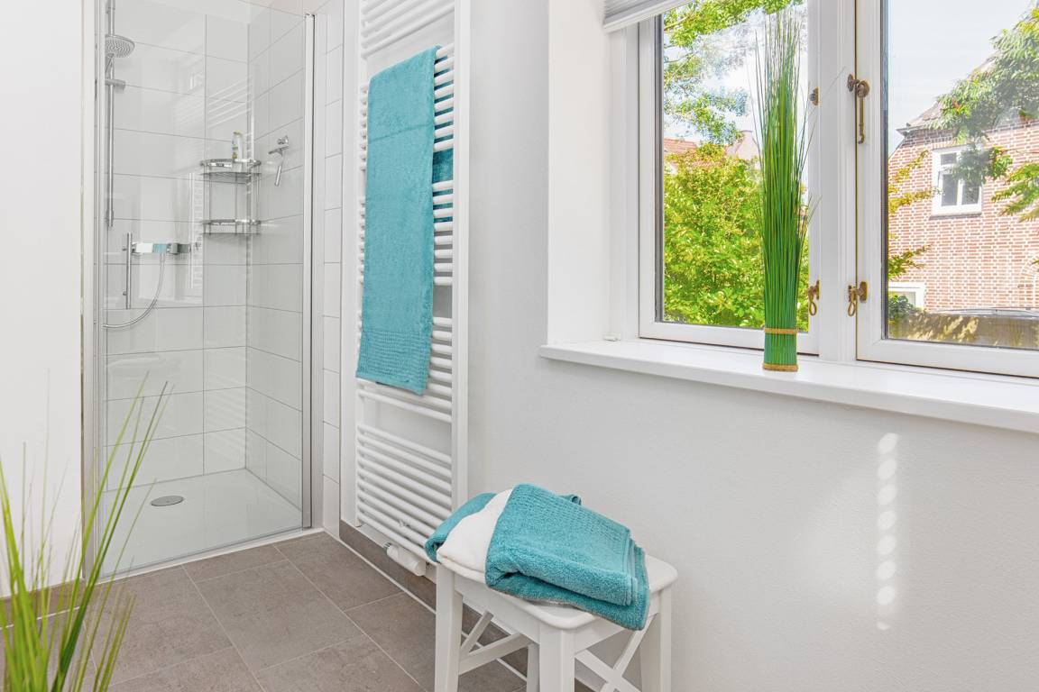 Das moderne Badezimmer ist mit einer ebenerdigen Dusche, einem Handtuchwärmer, Waschbecken und WC ausgestattet und bietet höchsten Komfort für eine erfrischende Auszeit. Zusätzlich gibt es im Erdgeschoss einen separaten Raum, der den Gästen des Gutshauses zur Verfügung steht. Hier befinden sich eine Waschmaschine, ein Bügeleisen und ein Bügelbrett für zusätzlichen Komfort während Ihres Aufenthalts.