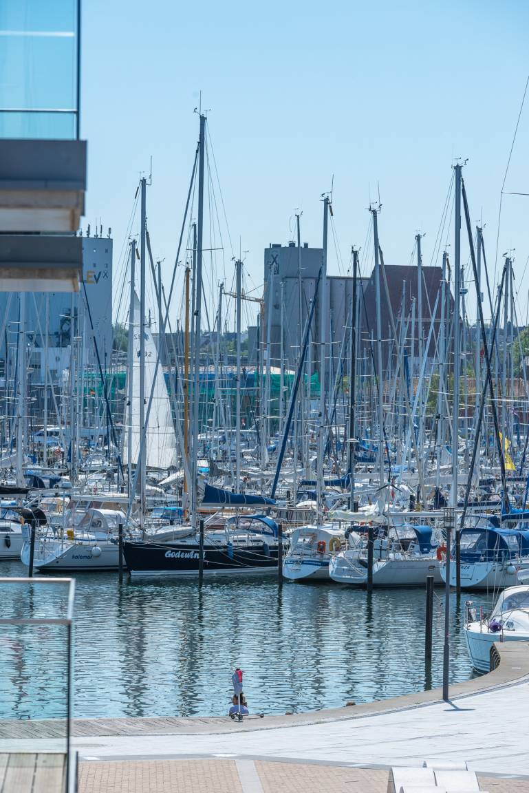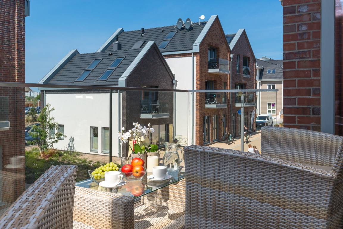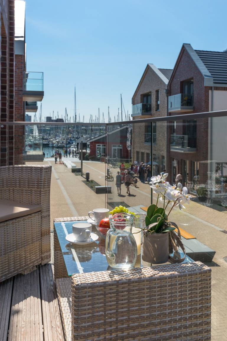 Der windgeschützte Balkon im Wohnzimmer lädt ein, um die Mittagssonne so richtig zu genießen, mit Blick auf die Yachthafen und die Ostsee. Auch abends lässt es sich hier, windgeschützt, sehr gut verweilen bei zum Beispiel einem schönen Glas Wein.