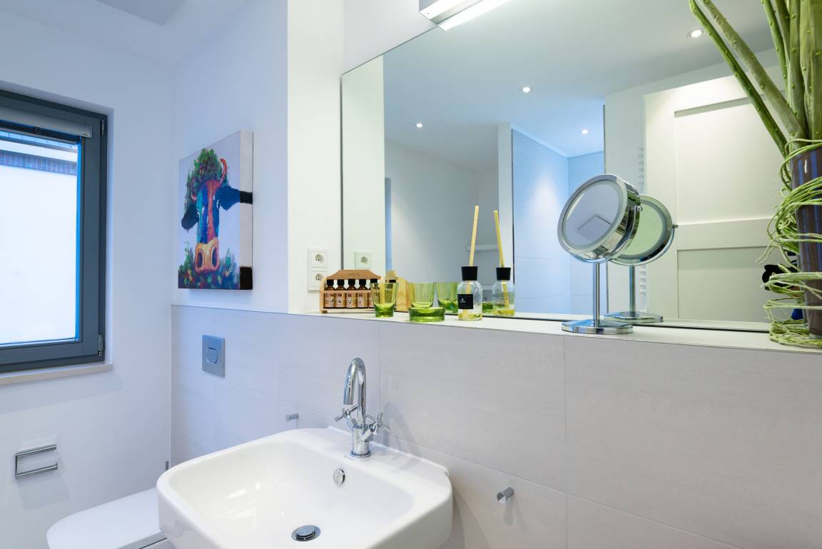 Im Badezimmer finden Sie eine großzügige Regendusche und bei Bedarf können Sie hier Ihre Wäsche waschen und trocknen. Das mit Tageslicht durchflutete Badezimmer bietet genügend Platz um sich für den Tag hübsch zu machen. Der Kosmetikspiegel hilft dabei. Die Handtuchheizung und die Fußbodenheizung runden das Ganze ab.