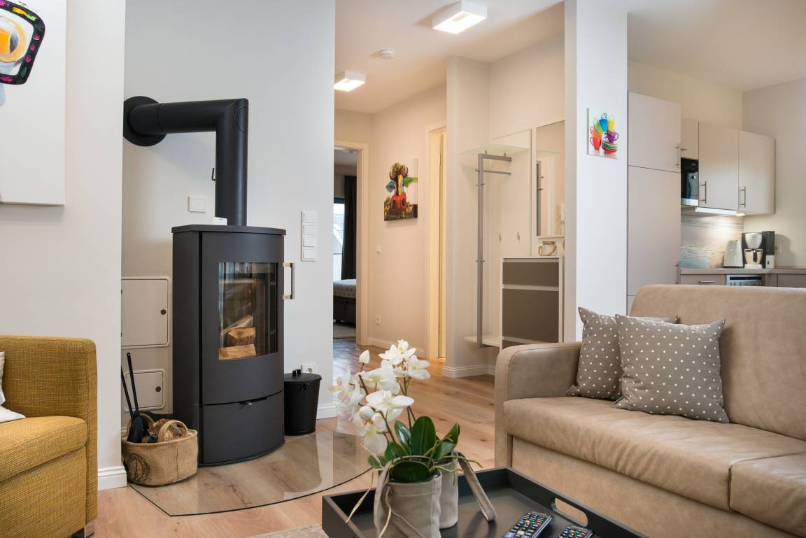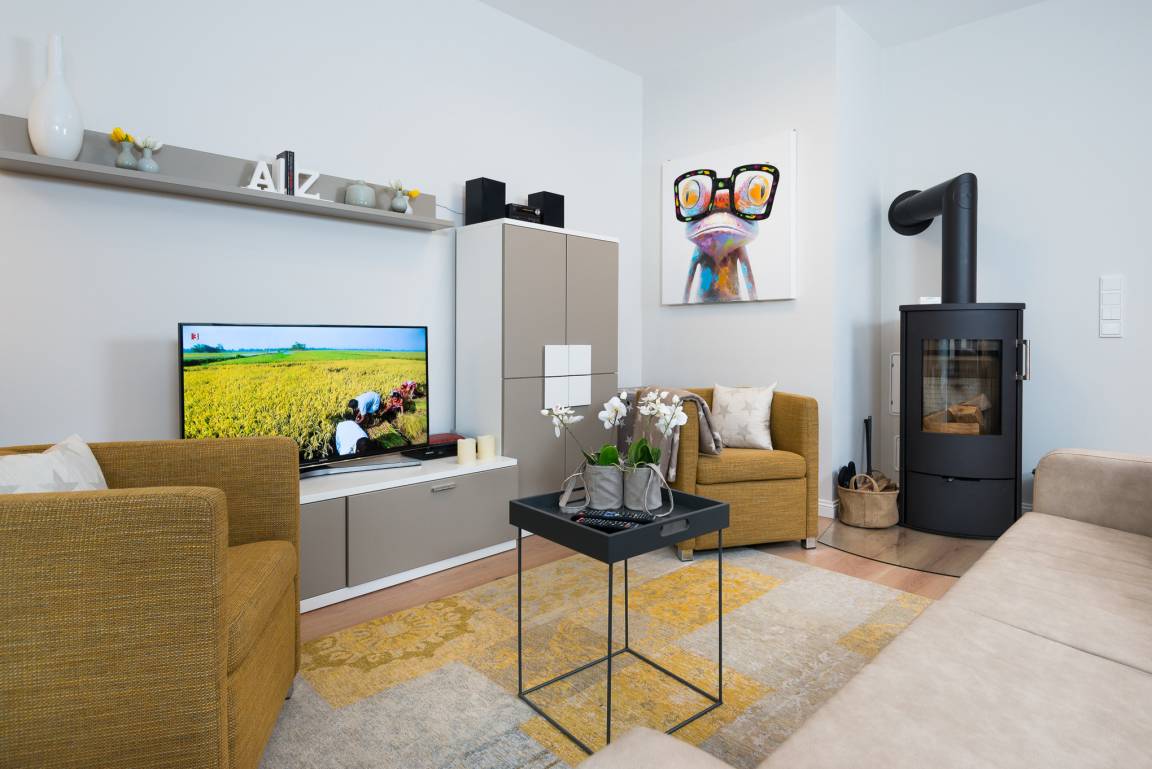 Im Wohnzimmer genießen Sie ruhige Momente und schauen Ihre Lieblingsserie im Fernsehen, dieser ist ein moderner Smart-Flachbildschirm Fernseher, der ebenfalls mit einem Blue-Ray Player ausgestattet ist. Gerne können Sie die vorhandene Spiele-Sammlung benutzen und wenn es etwas kälter draußen sein sollte, kann das flackerende Feuer im Kamin für eine wohlige Wärme und eine Wie-Zuhause-Atmosphäre sorgen. Ihre eigene CD's können Sie gerne über die Musikanlage abspielen oder Sie hören Internetradio. Natürlich kann auch ein USB-Stick abgespielt werden.