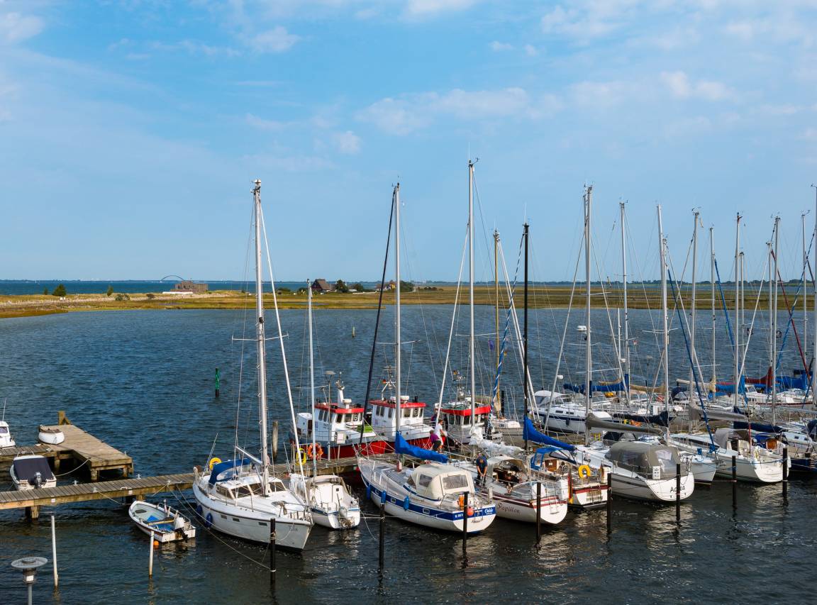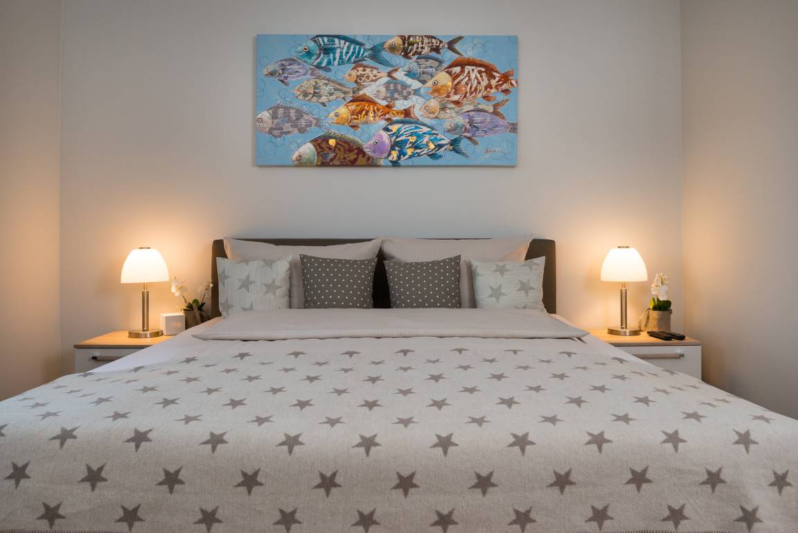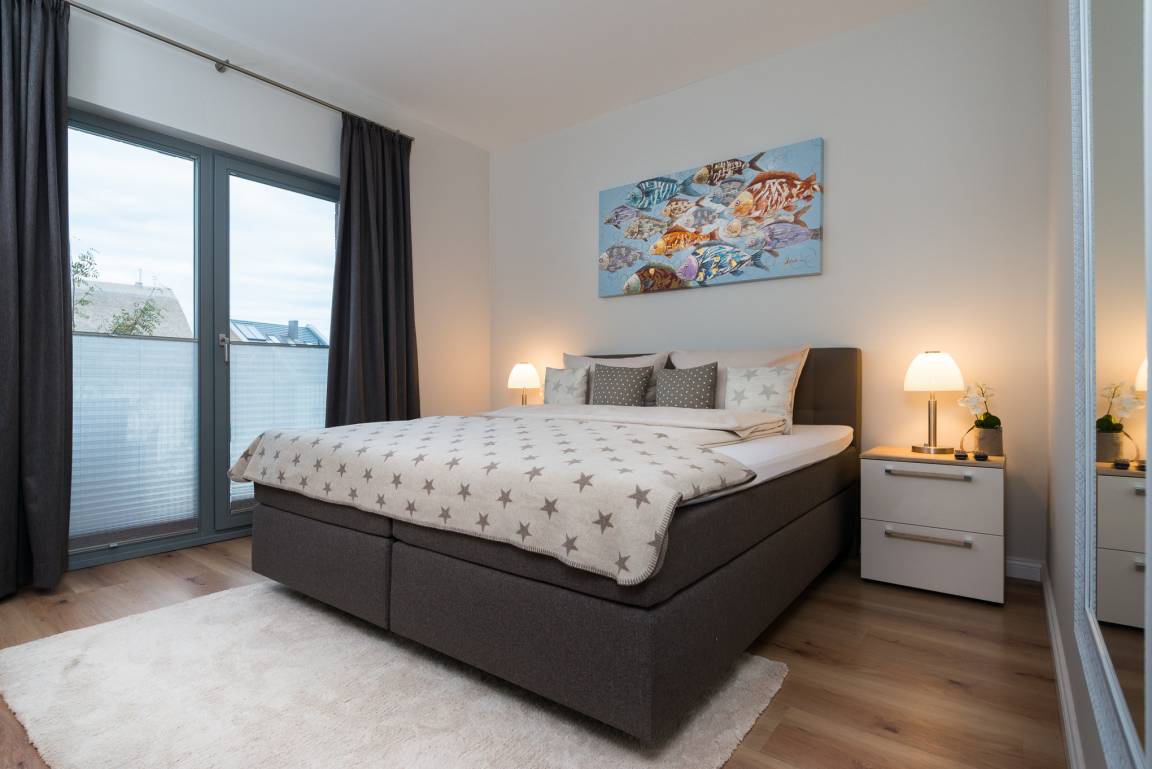 Das Schlafzimmer ist ausgestattet mit einem großen Boxspringbett und der angrenzend windgeschützten Balkon bietet die Möglichkeit morgens in der Sonne die erste leckere Tasse Kaffee oder Tee zu genießen. Lassen Sie hier Ihren Blick über die schönen Reetdach Häuser schweifen und erhaschen Sie sich einen ersten Blick auf die Ostsee, das Naturschutzgebiet "Graswarder" und den Yachthafen. Besser kann ein Tag nicht anfangen!