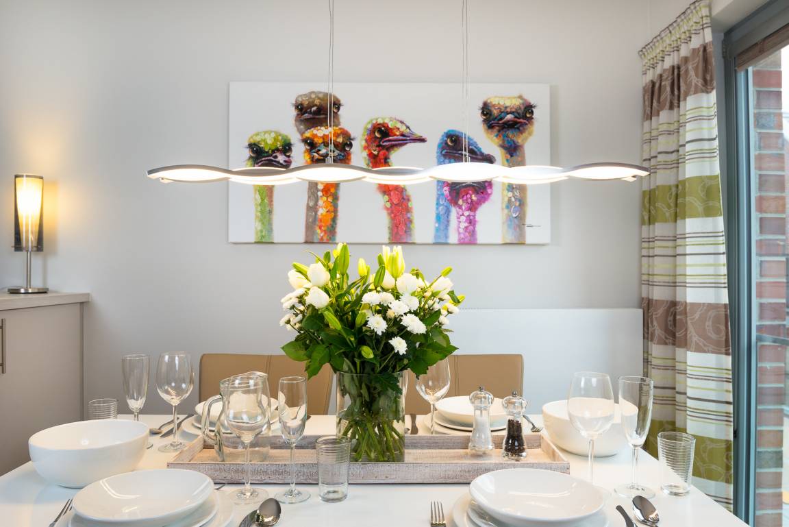 Am Esstisch genießen Sie ihr Frühstück, Mittag- oder Abendessen oder Sie sitzen einfach gemütlich beisammen und können durch die bodentiefen Fenster mit viel Tageslicht Ihre Ruhe genießen.