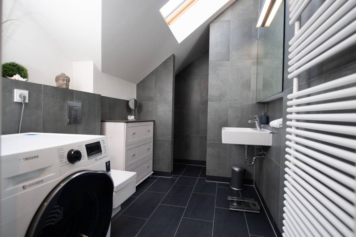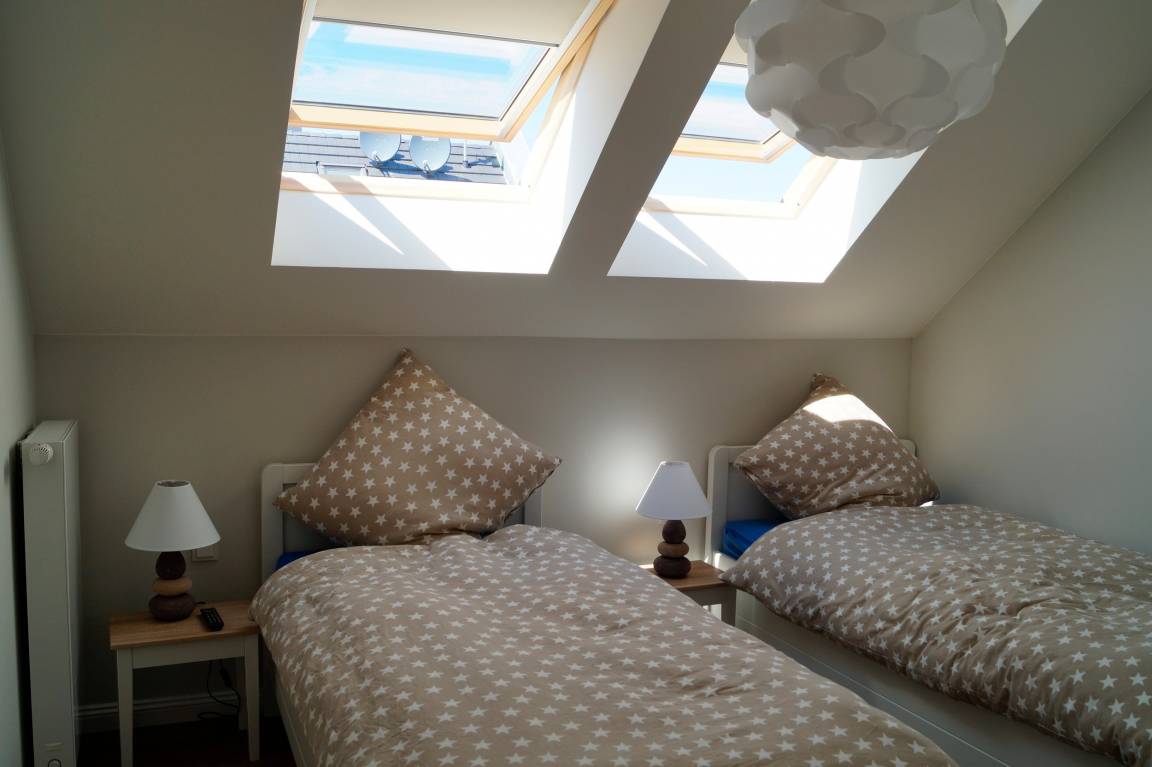 Die Ferienwohnung bietet eine hochwertige Ausstattungslinie mit Küche, Sauna und Kamin. Zwei Schlafzimmer, eins davon mit Boxspringbett, das zweite mit zwei Einzelbetten. Ideal für eine Familie mit zwei Kindern als auch für vier Erwachsene. Genießen Sie in beiden Schlafzimmern die Verdunklungsmöglichkeiten der Fenster.