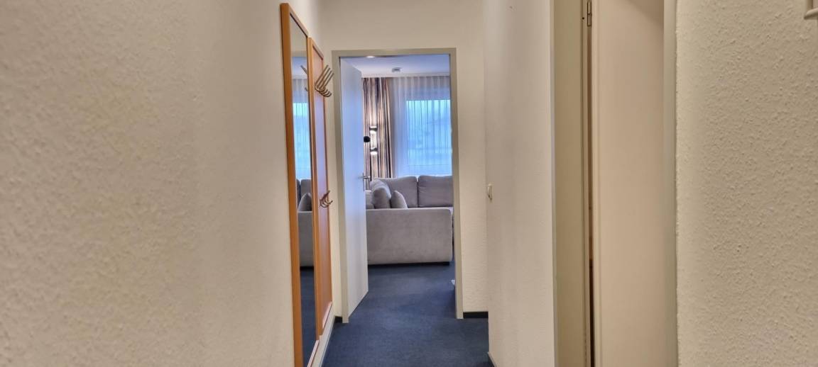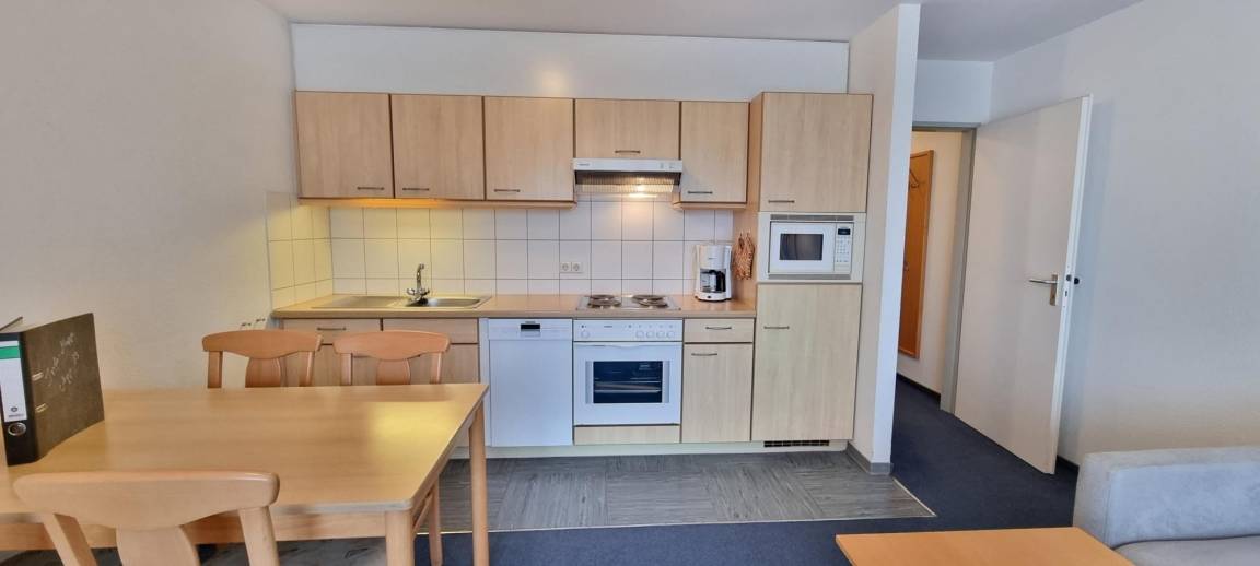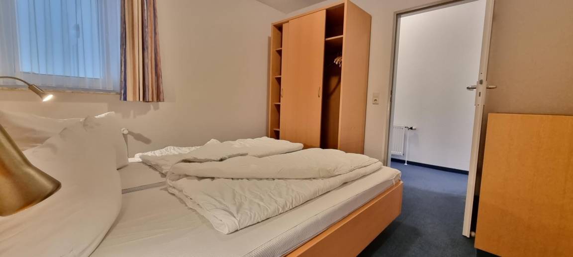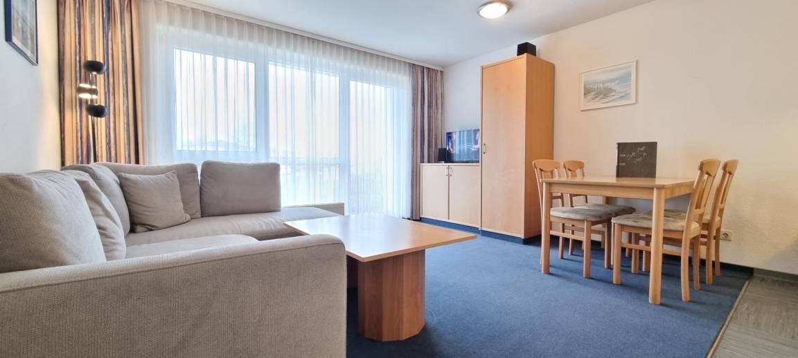 Die Ferienwohnung verfügt über ein separates Schlafzimmer mit einem bequemen Doppelbett und einem geräumigen Kleiderschrank – perfekt für Ihre Urlaubsgarderobe. Im kombinierten Wohn- und Essbereich finden Sie eine gut ausgestattete Küchenzeile sowie eine gemütliche Couch mit Schlaffunktion, die zusätzlichen Schlafplatz bietet.