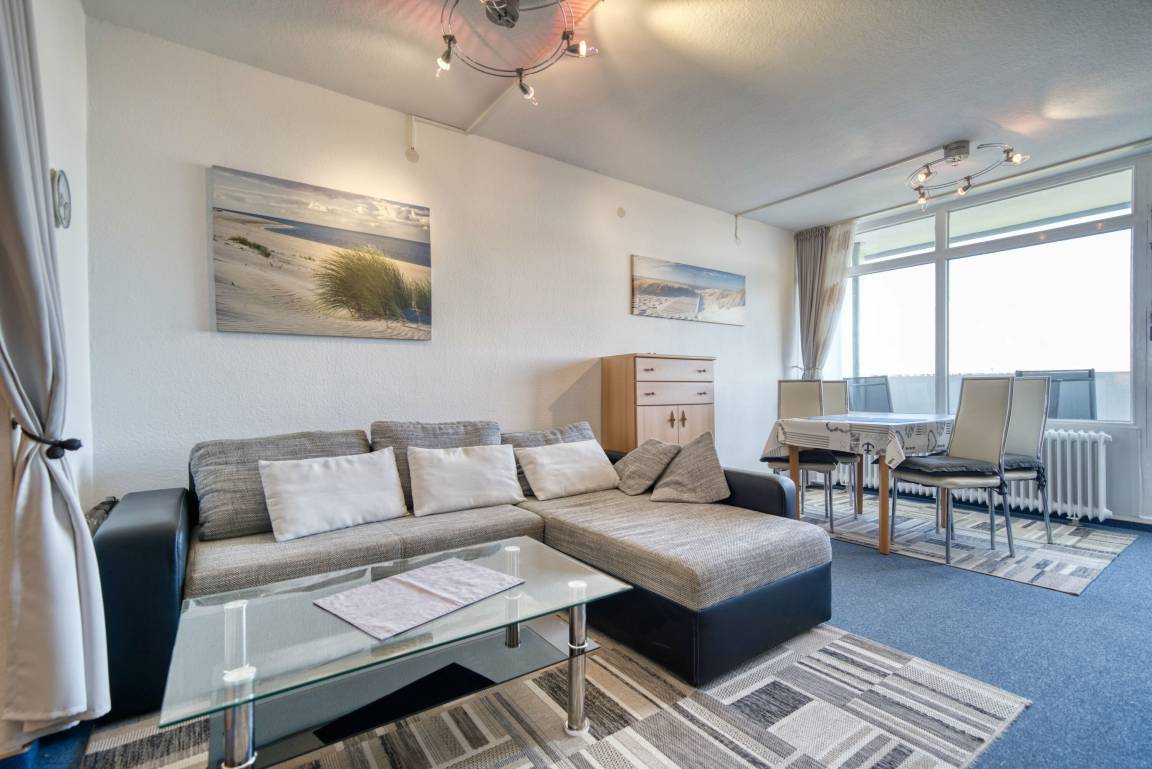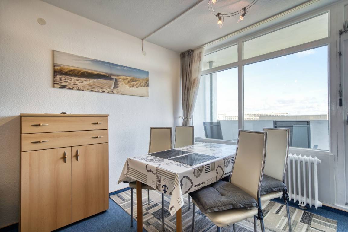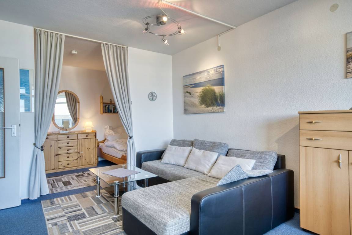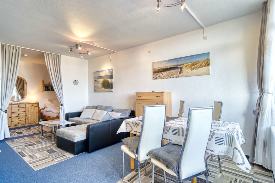 Wohn-/Schlafzimmer mit zwei Einzelbetten, Ecksofa, TV und Esstisch. Separates Schlafzimmer mit Einzelbett und TV. Küche mit Cerankochfeld, Kühlschrank, Mikrowelle, Toaster, Wasserkocher. Bad mit Dusche und WC. Nichtraucherwohnung, keine Haustiere, kein WLAN. Fahrstuhl, Fahrradräume, ca. 300 m bis Strand, Parkplatz inklusive. Perfekt für Ruhe, Aussicht und entspannten Ostseeurlaub.
