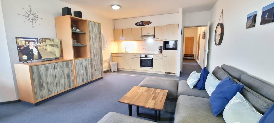 Das separate Schlafzimmer mit Doppelbett und Kleiderschrank sorgt für erholsame Nächte. Der kombinierte Wohnbereich mit Küchenzeile ermöglicht flexible Selbstverpflegung, während der westlich ausgerichtete Eckbalkon mit Balkonmöbeln zu entspannten Stunden bei Sonnenuntergang einlädt.