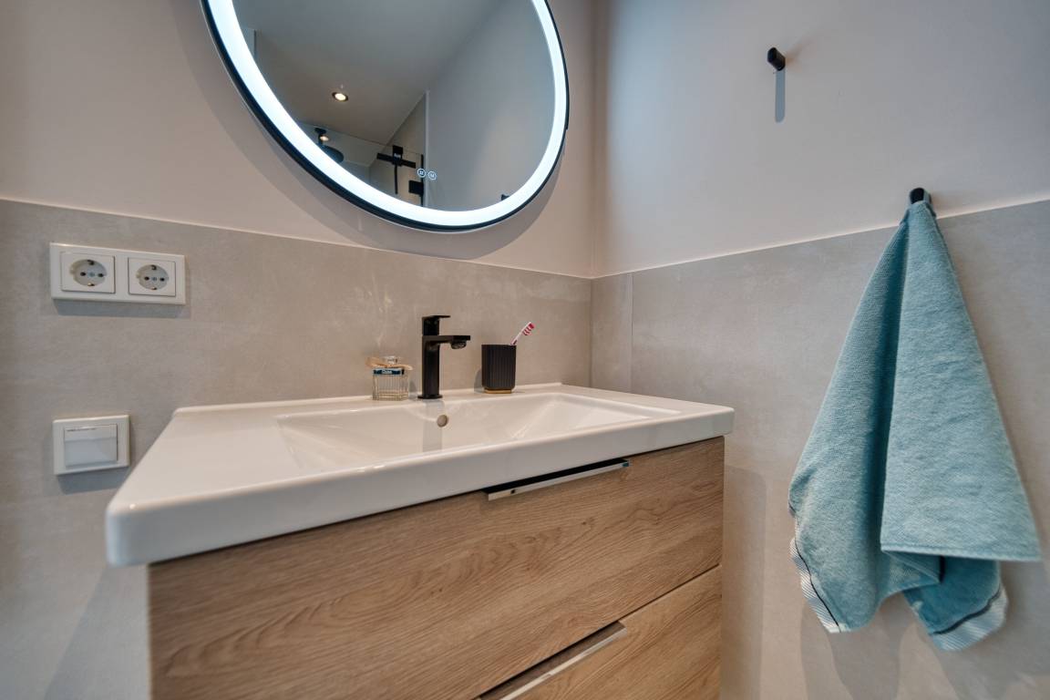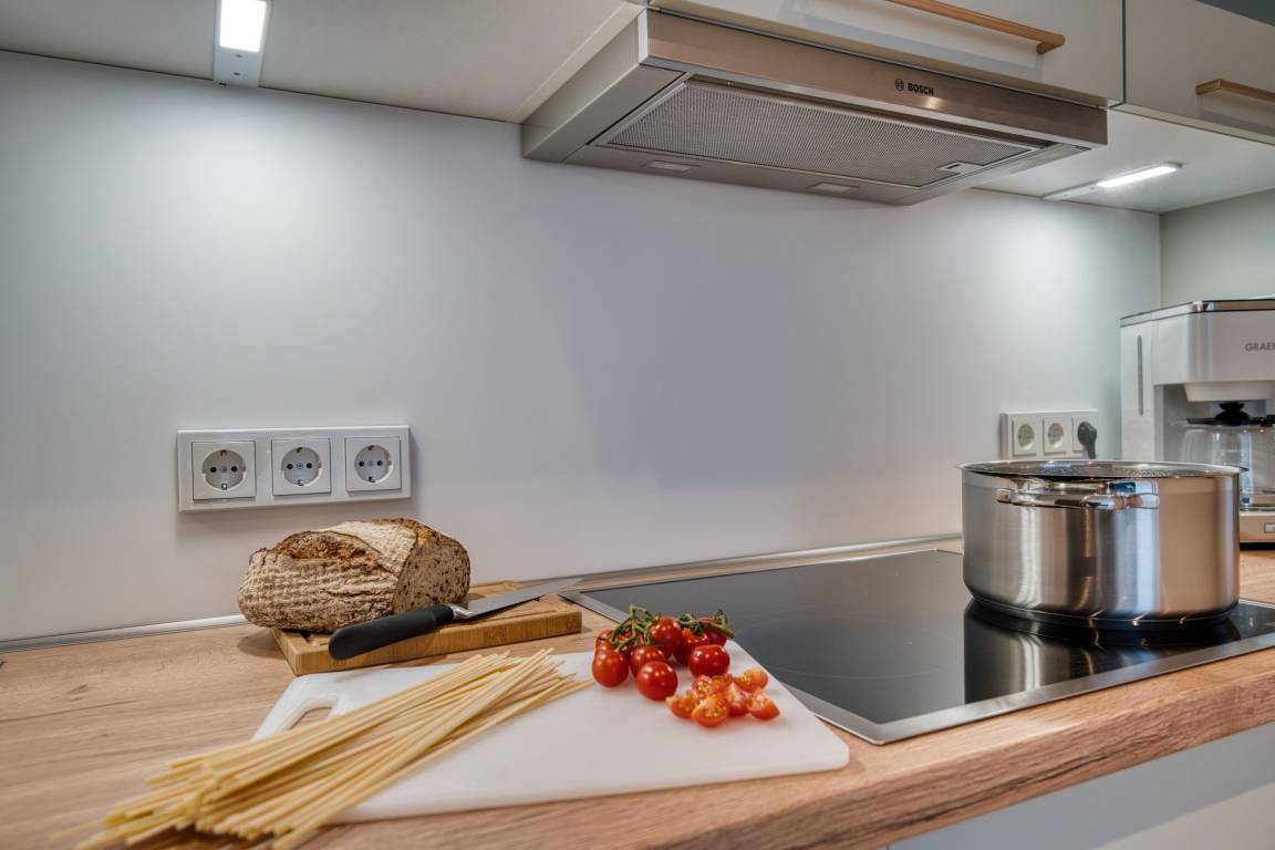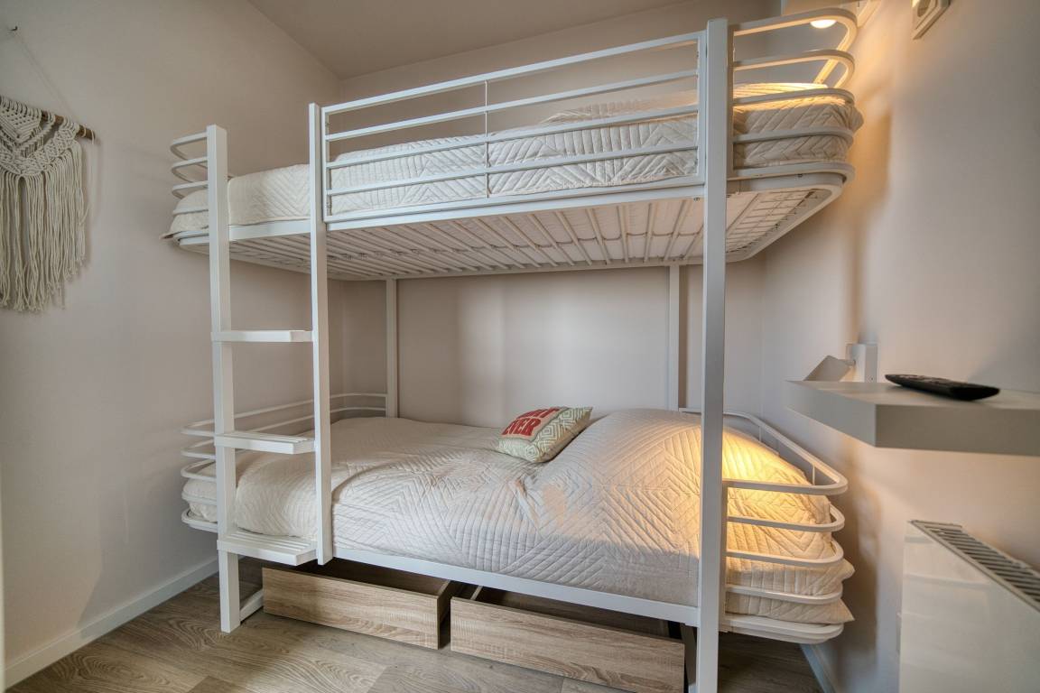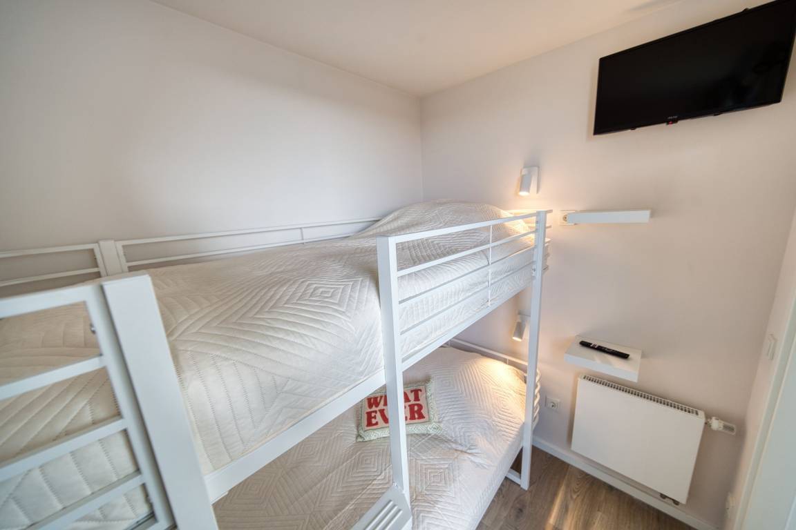Die Wohnung verfügt über ein separates Schlafzimmer mit Doppelbett und Einbauschrank, Kinderzimmer mit Etagenbett und Stauraum, Wohnbereich mit Sofa und Smart-TV sowie zwei Smart-TVs insgesamt. Die Küche ist komplett ausgestattet mit Cerankochfeld, Backofen, Geschirrspüler, Kühlschrank mit Gefrierfach, Mikrowelle, Kaffeemaschine, Toaster und Wasserkocher. Modernes Bad mit ebenerdiger Dusche. Vinylfußboden, kostenloser Strandkorb in der Sommersaison, Netflix inklusive. Strand ca. 300 m, Aktiv-Hus, Shops und Freizeitangebote direkt im Ferienpark.