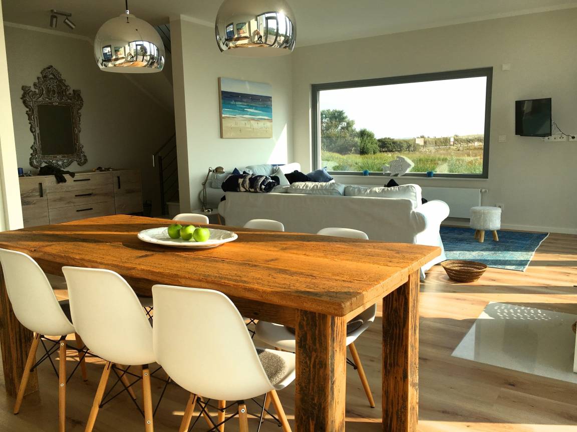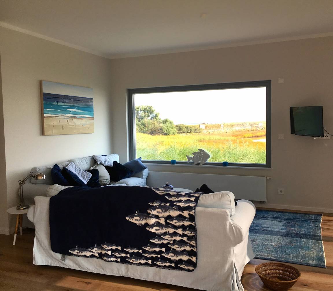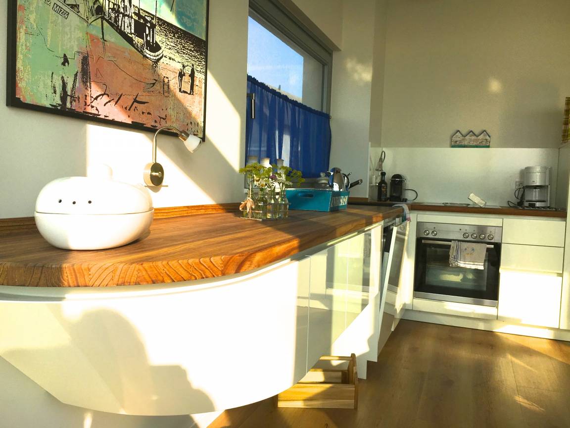 Eingerichtet im maritimen Stil befindet sich im geräumigen Wohnzimmer eine offene Küche in Schiffsform.