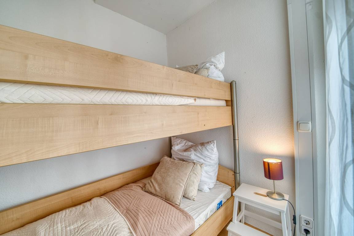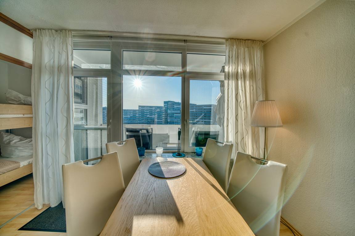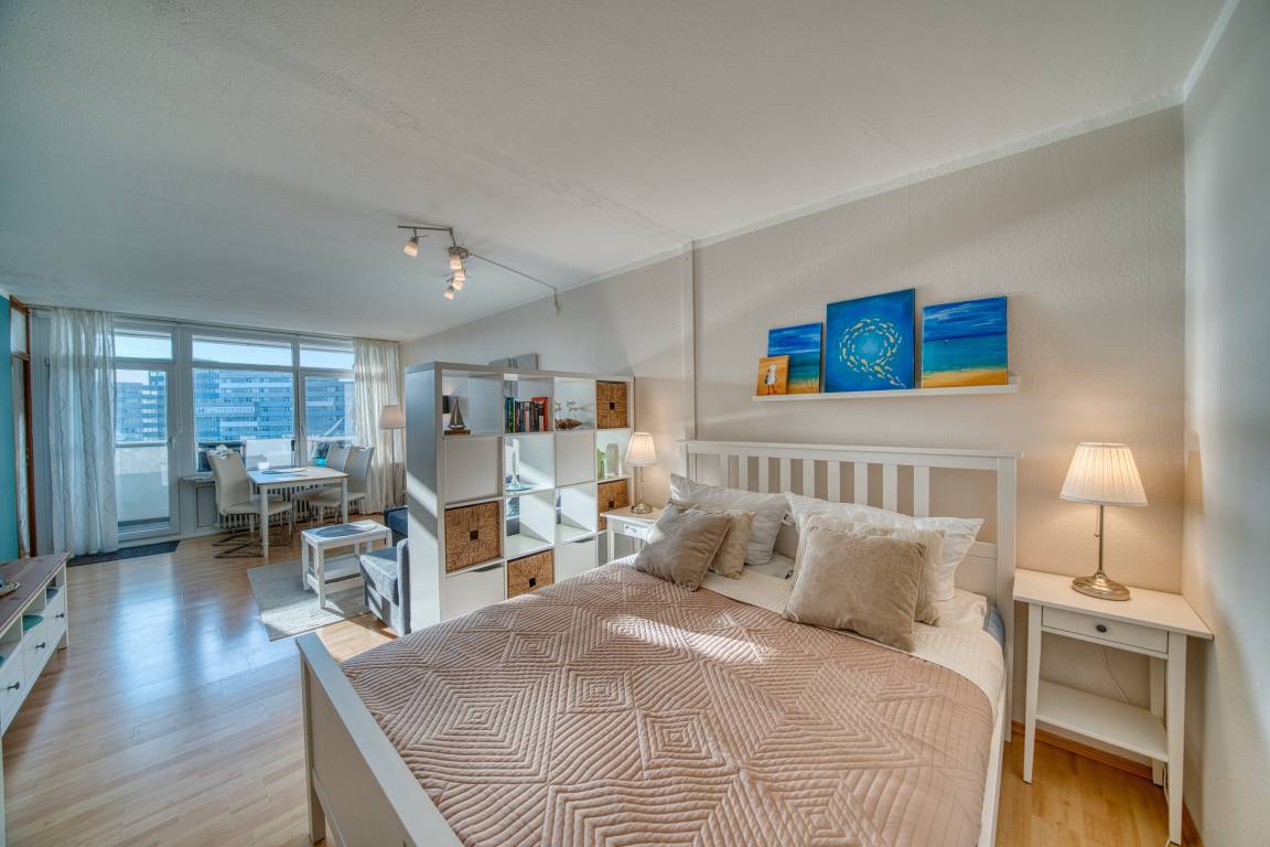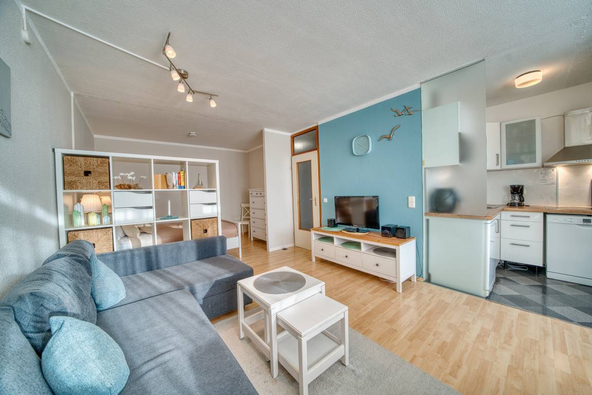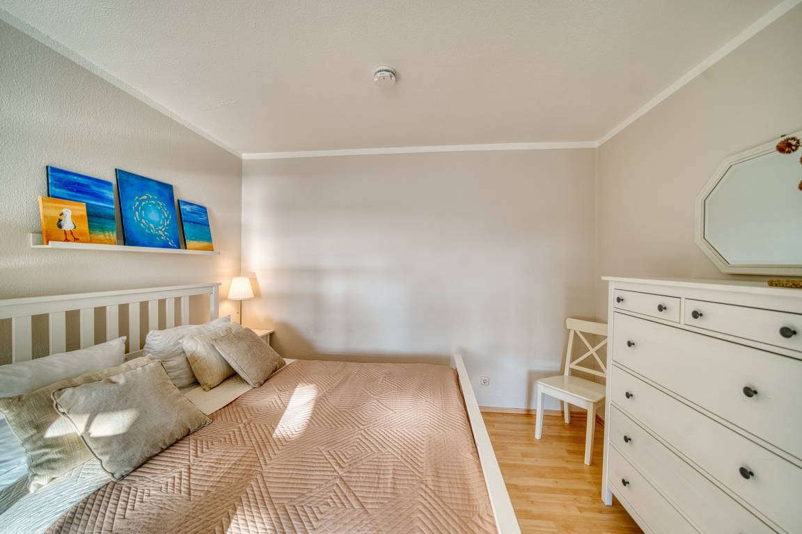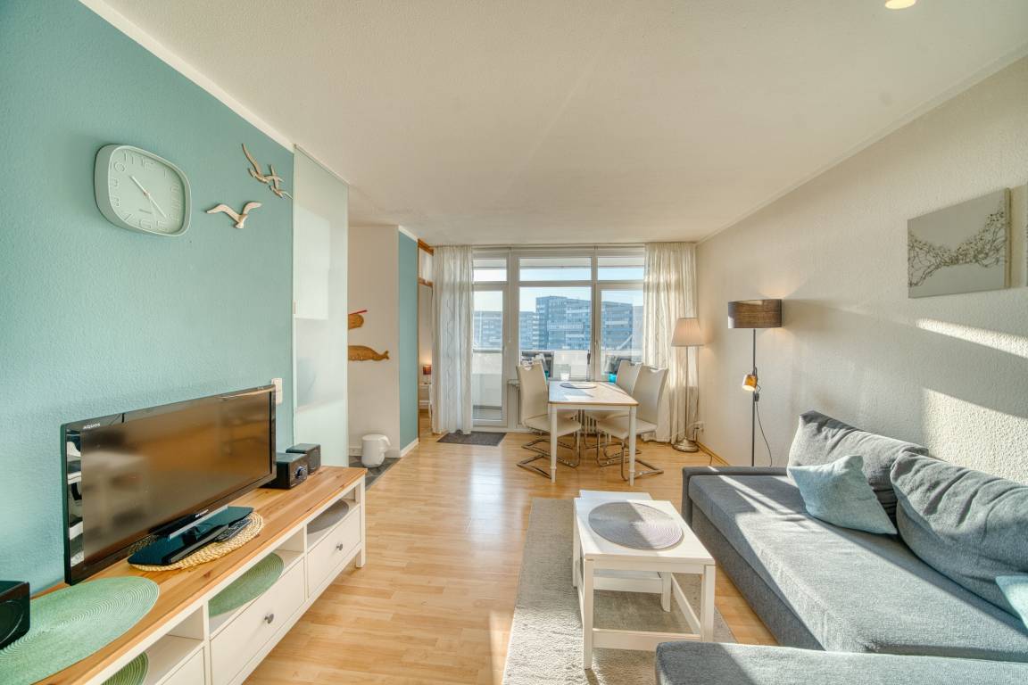 Südlicher Balkon mit Binnenseeblick, Wohn-/Schlafbereich mit Doppelbett, separates Kinderzimmer mit Etagenbett, TV. Laminatboden. Küchenzeile mit Herd, Geschirrspüler und Mikrowelle. Bad mit Duschkabine, Hänge-WC und Handtuchtrockner. Ca. 300 m zum Strand, kostenloser Parkplatz, Fahrstuhl, abschließbare Fahrradräume, ca. 30 m zum Aktiv-Hus und Ladenzeile. Nichtraucherwohnung, keine Haustiere, .