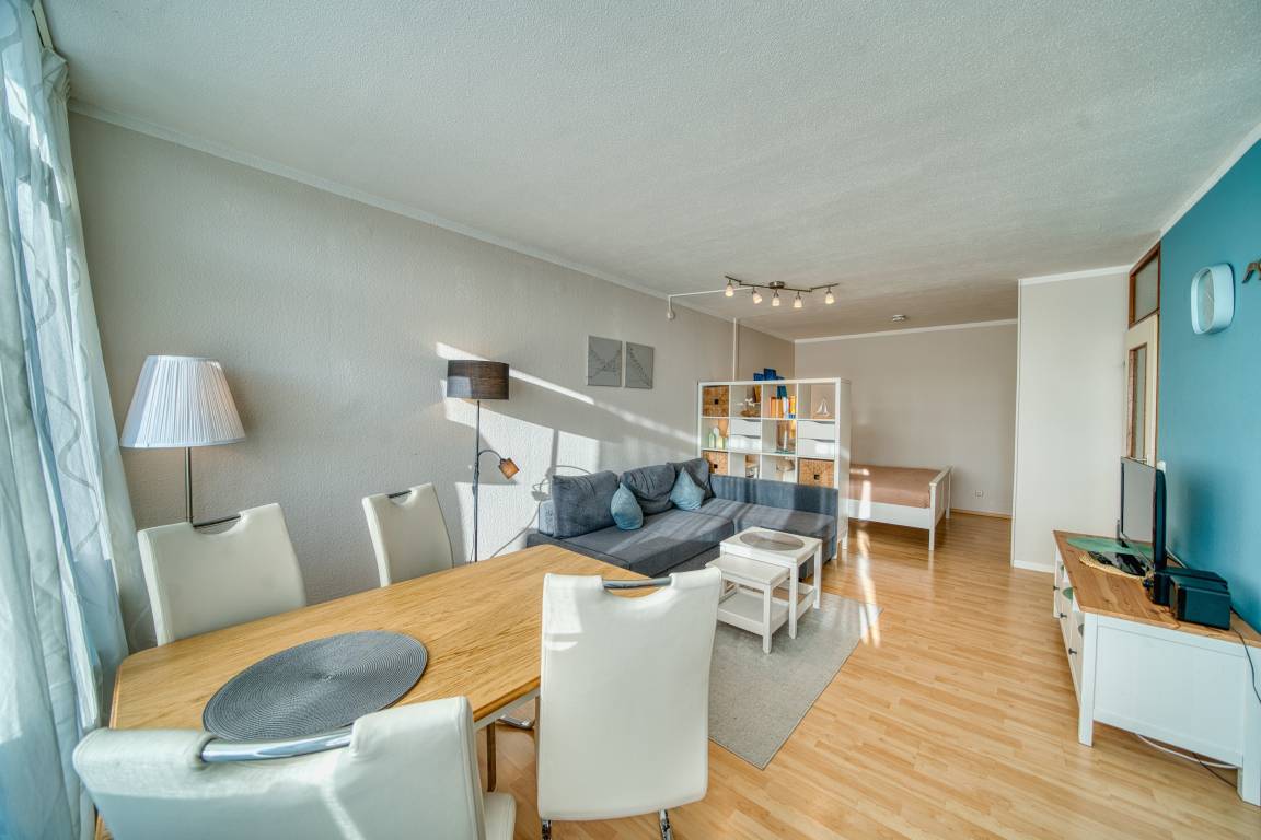 Freuen Sie sich auf entspannte Urlaubstage in dieser freundlich eingerichteten Ferienwohnung im 6. Obergeschoss des Hauses C im beliebten Ostsee-Ferienpark Heiligenhafen. Mit viel Sonnenlicht, einem seitlichen Blick auf den Binnensee und praktischer Ausstattung ist sie ideal für Paare oder Familien mit Kindern.