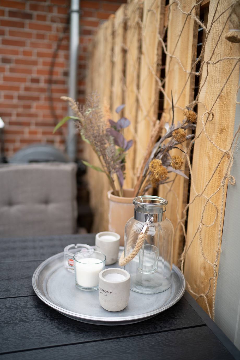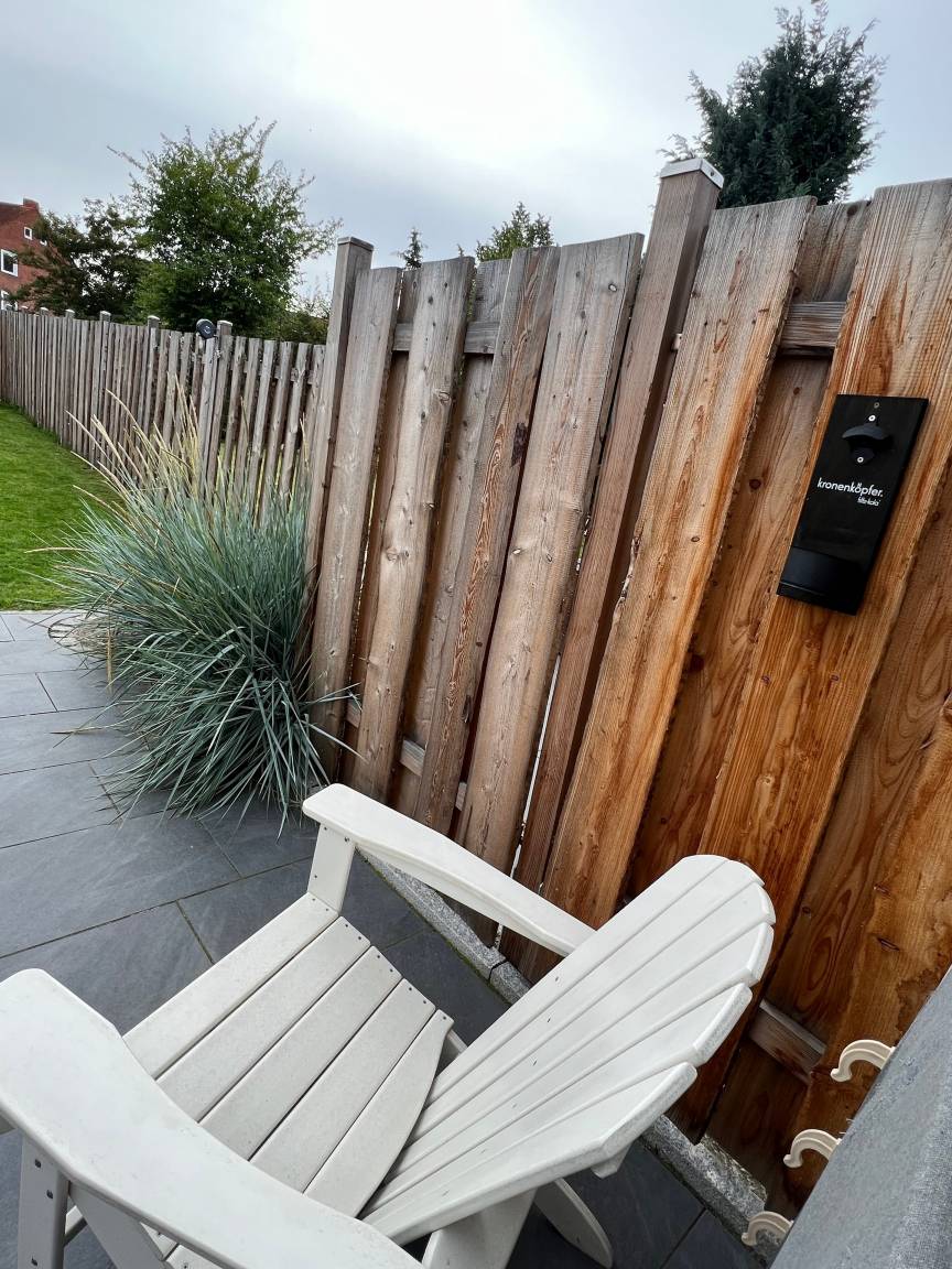 Die große Terrassentür führt Euch in den Garten. Eine Überdachung aus Glas sorgt für Schutz bei unbeständigem Wetter. Für die Kinder oder den Hund bietet der komplett umzäunte Garten Auslauf und Platz zum Toben.