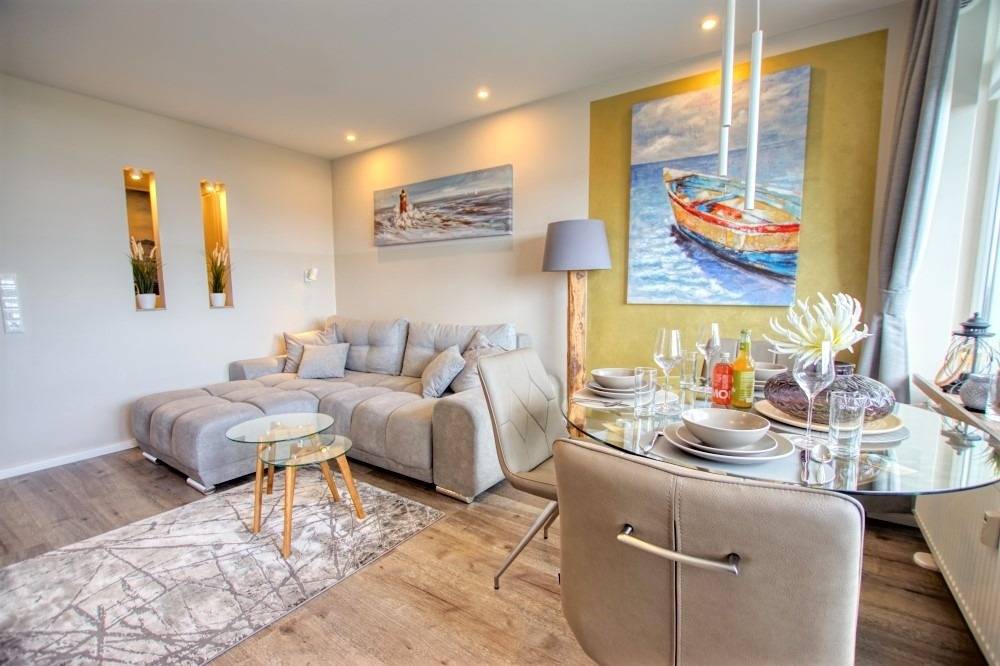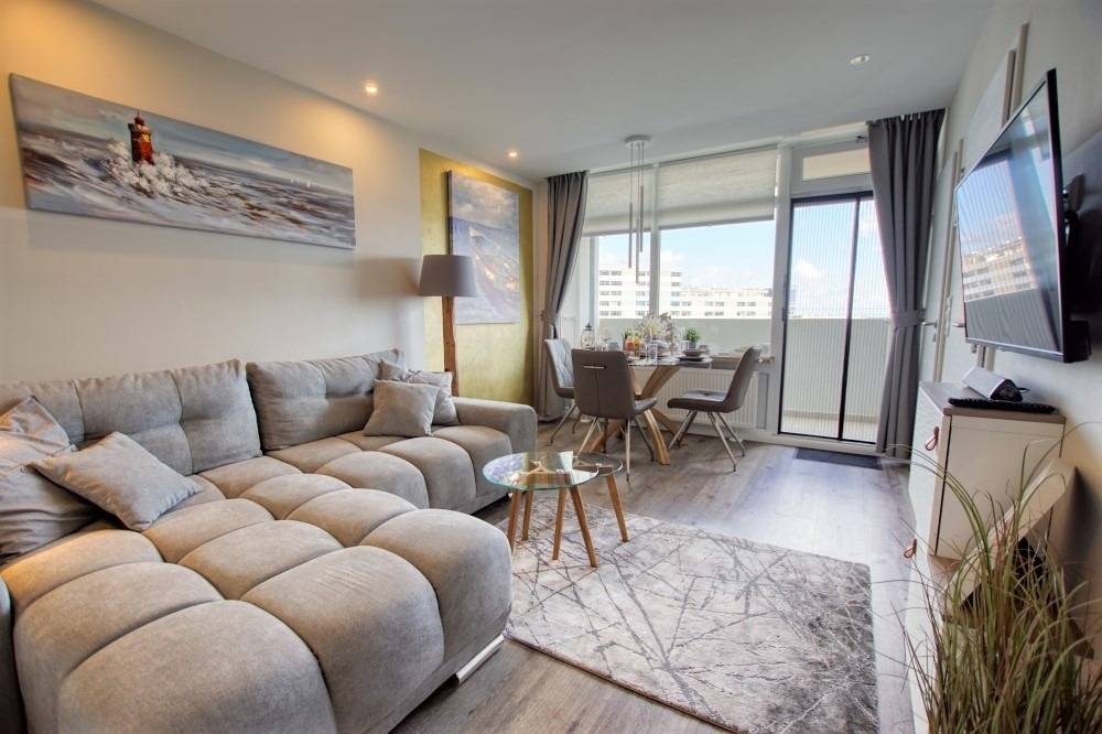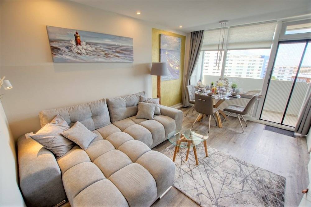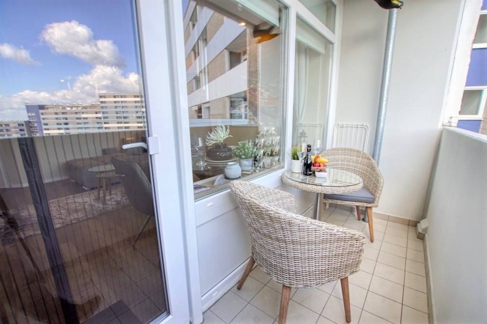 Die 45 m² große Wohnung bietet eine Küche im Eingangsbereich mit Induktionskochfeld, Spülmaschine, Backofen, Mikrowelle, Kühlschrank, Kaffeemaschine, Wasserkocher und Toaster. Wohnbereich mit Sitzecke, Essbereich im Beachhouse-Stil und Flachbild-TV. Schlafzimmer mit Doppelbett und TV, Kinderzimmer mit Einzelbett und TV. Modernes Bad mit begehbarer Dusche. Vinylboden, Balkon mit Aussicht, WLAN. Nichtraucher, keine Haustiere, Fahrstuhl, kostenfreier Parkplatz. Geeignet für bis zu 3 Personen.