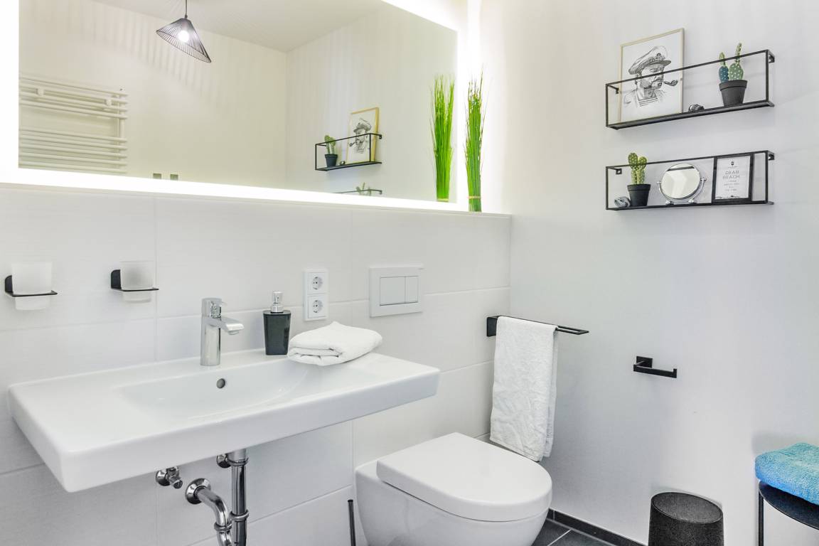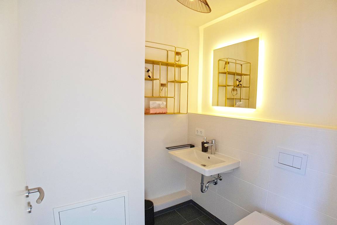 Das elegante Badezimmer mit ebenerdiger Dusche und hochwertigen Details bietet viel Komfort, während ein zusätzliches Gäste-WC für noch mehr Bequemlichkeit sorgt. Eine eigene Waschmaschine steht Ihnen ebenfalls zur Verfügung.