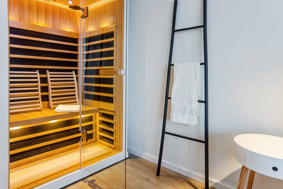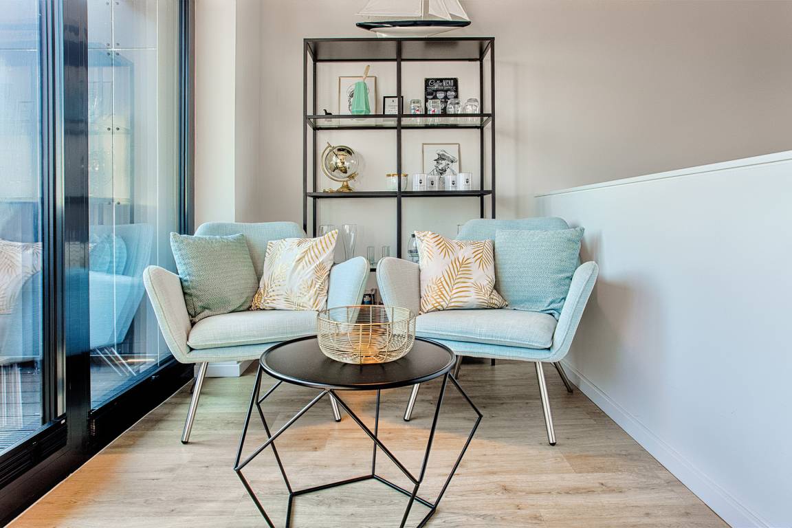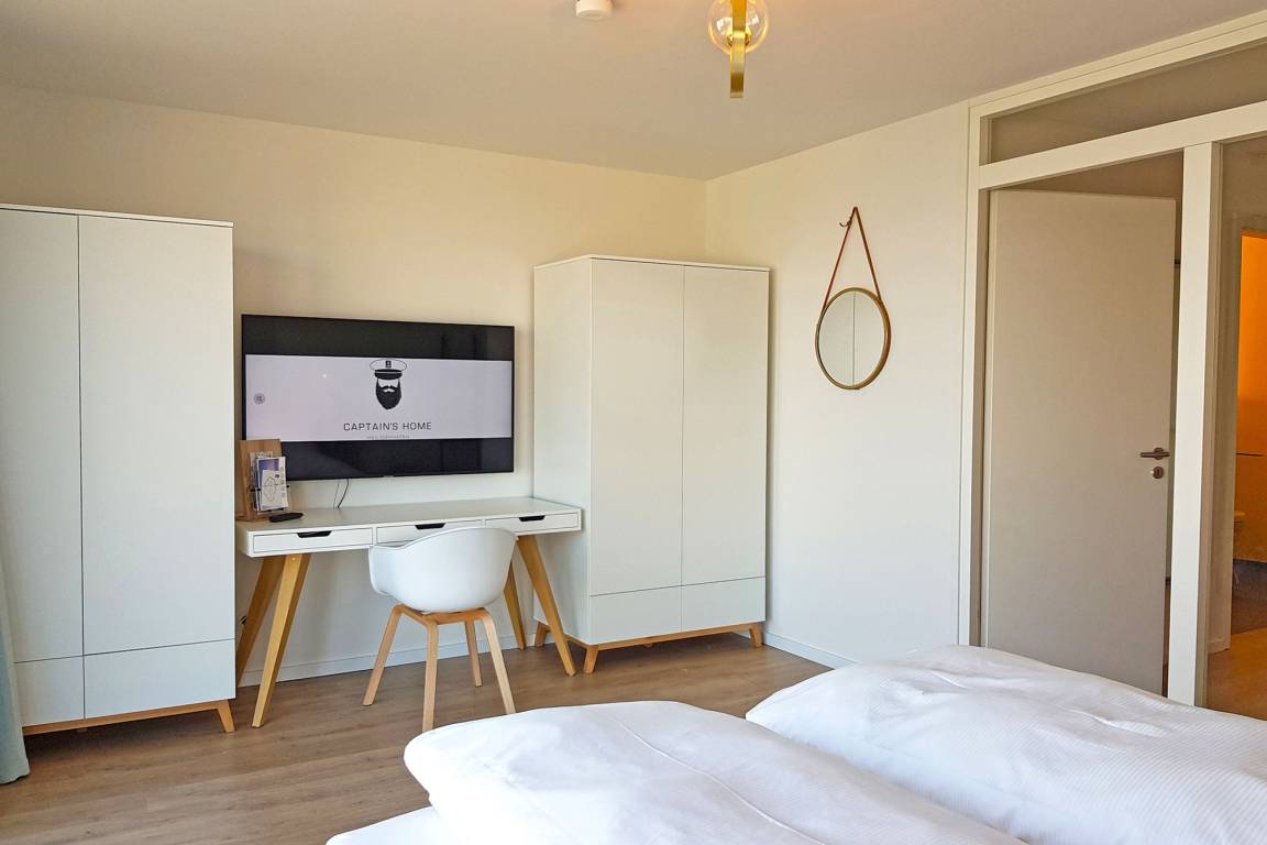 Für bis zu vier Personen bietet das „Captain's Home" höchsten Wohnkomfort. Das separate Schlafzimmer mit Doppelbett und TV lädt im 1. Obergeschoss zu erholsamen Nächten ein, während im oberen Wohnbereich eine gemütliche Schlafcouch (1,60 m) sowie ein zusätzlicher Schlafsessel für weitere Gäste bereitstehen. Die geschmackvolle Einrichtung mit bequemer Lounge-Couch, Smart-TV und schnellem WLAN sorgt für entspannte Stunden. Ein besonderes Highlight ist die integrierte Infrarot-Sauna – ideal, um nach einem Tag an der frischen Meeresluft zu regenerieren.