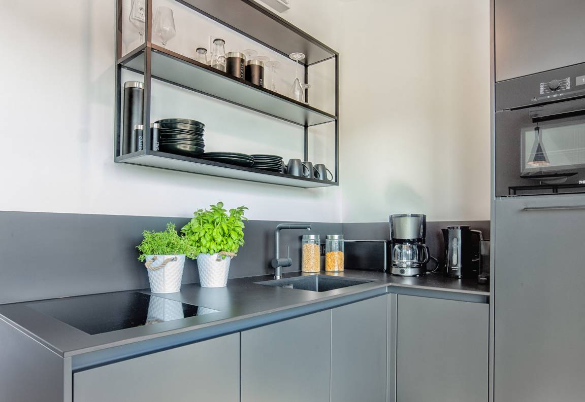 Der offene Wohn- und Essbereich schafft mit großen Fensterfronten eine einzigartige Atmosphäre und bietet Ihnen nicht nur viel Platz zum Verweilen, sondern auch eine erstklassige Aussicht auf den Hafen. Direkt angrenzend befindet sich die voll ausgestattete Küche mit modernen Geräten, in der Sie kulinarische Köstlichkeiten zaubern können. Genießen Sie Ihre Mahlzeiten am stilvollen Esstisch oder lassen Sie sich auf einer der beiden möblierten Dachterrassen nieder. Während die Südterrasse tagsüber sonnige Stunden verspricht, lädt die Nordterrasse am Abend zu einem Glas Wein bei traumhaftem Sonnenuntergang ein. Ein Elektro-Grill steht Ihnen für gesellige Barbecue-Abende zur Verfügung.