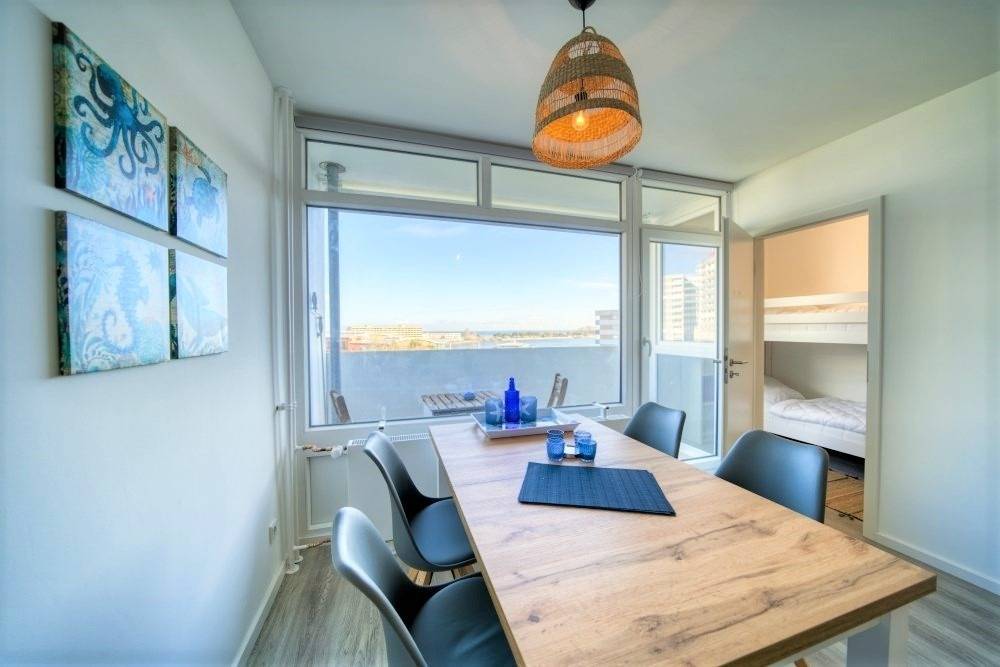 Wohnfläche ca. 45 m², mediterran eingerichtet, fertiggestellt März 2023. Elternschlafbereich mit Boxspringbett und TV, Kinderzimmer mit Etagenbett und TV. Offener Wohnbereich mit XL Smart-TV, Sofa und Esstisch. Küche voll ausgestattet mit Backofen, Ceranfeld, Kühlschrank/Gefrierfach, Dunstabzugshaube. Modernes Bad mit Dusche. Balkon mit Markise, moderner Fußboden. Highspeed-WLAN, kostenloser Strandkorb (Mai–September). Nichtraucher, keine Haustiere, max. 4 Personen, Fahrstuhl, kostenfreier PKW-Stellplatz. Strand ca. 300 m, Ferienpark mit Shops, Aktiv-Hus, Schwimmbad, Sauna, Wellness und Kinderspielwelt.
