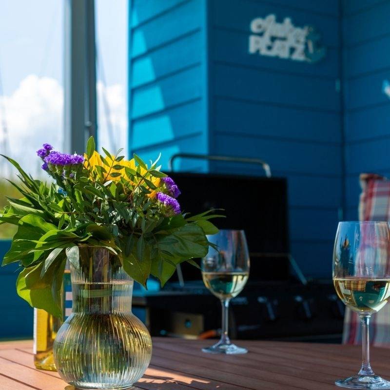 Auf der Terrasse, die über den Wohnbereich zu erreichen ist, genießen Sie Ihren Kaffee/ Tee am Morgen, oder Sie veranstalten ein leckeres Barbecue am Abend direkt am Bord.