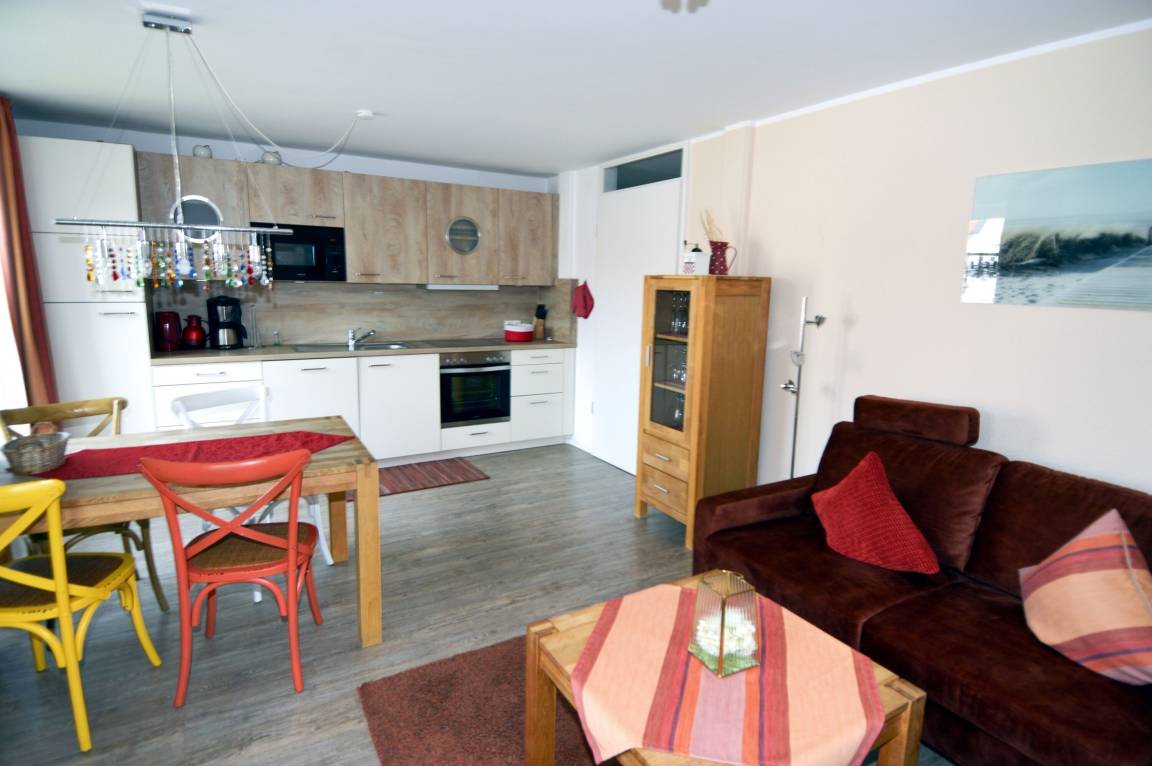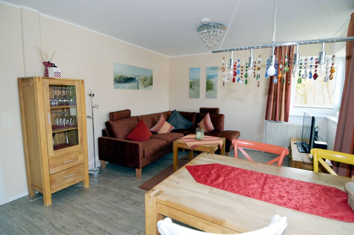 Herzstück der Wohnung ist der helle Wohn- und Essbereich, der mit einer gemütlichen Couch, einem Esstisch sowie einem Fernseher ausgestattet ist. Hier können Sie entspannte Stunden verbringen, gemeinsam essen oder den Urlaubstag in ruhiger Atmosphäre ausklingen lassen. WLAN / WiFi sowie ein Radio stehen ebenfalls zur Verfügung und sorgen für Unterhaltung und Komfort während Ihres Aufenthaltes.