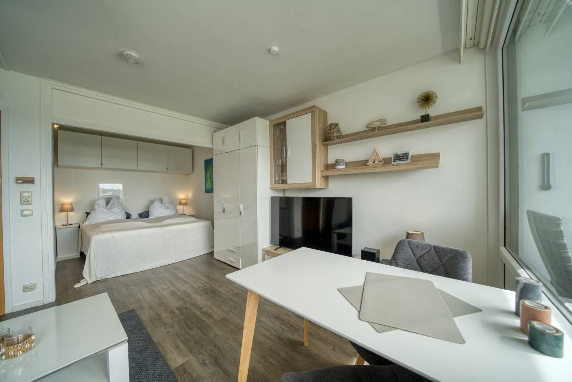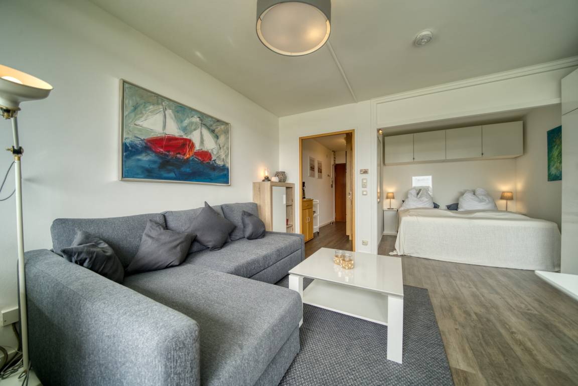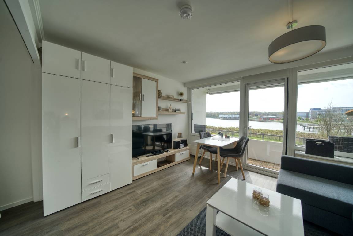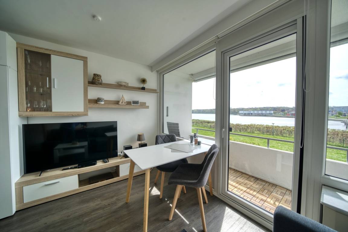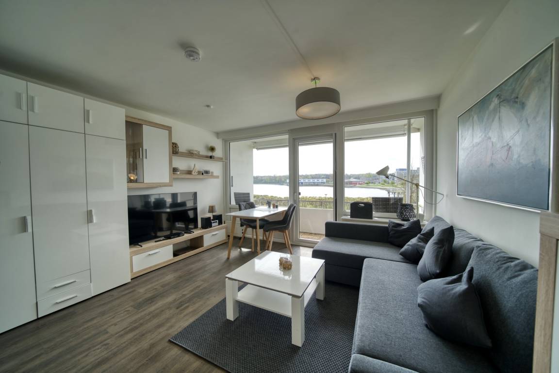 Wohn-/Schlafbereich mit Couch, Doppelbett und Kabel-Flat-TV. Küchenzeile mit allen wichtigen Geräten. Modernes Duschbad. Balkon mit Sonnenmarkise. Nichtraucherwohnung, keine Haustiere. Eigener Pkw-Stellplatz und gemeinschaftlicher Fahrradkeller im Haus. Strand nur ca. 10 m entfernt, Ferienpark mit Läden, Restaurants und Freizeiteinrichtungen ca. 5 Gehminuten. Ideal für entspannte Tage am Binnensee.