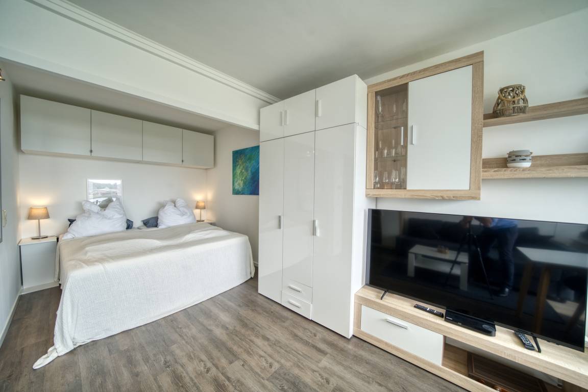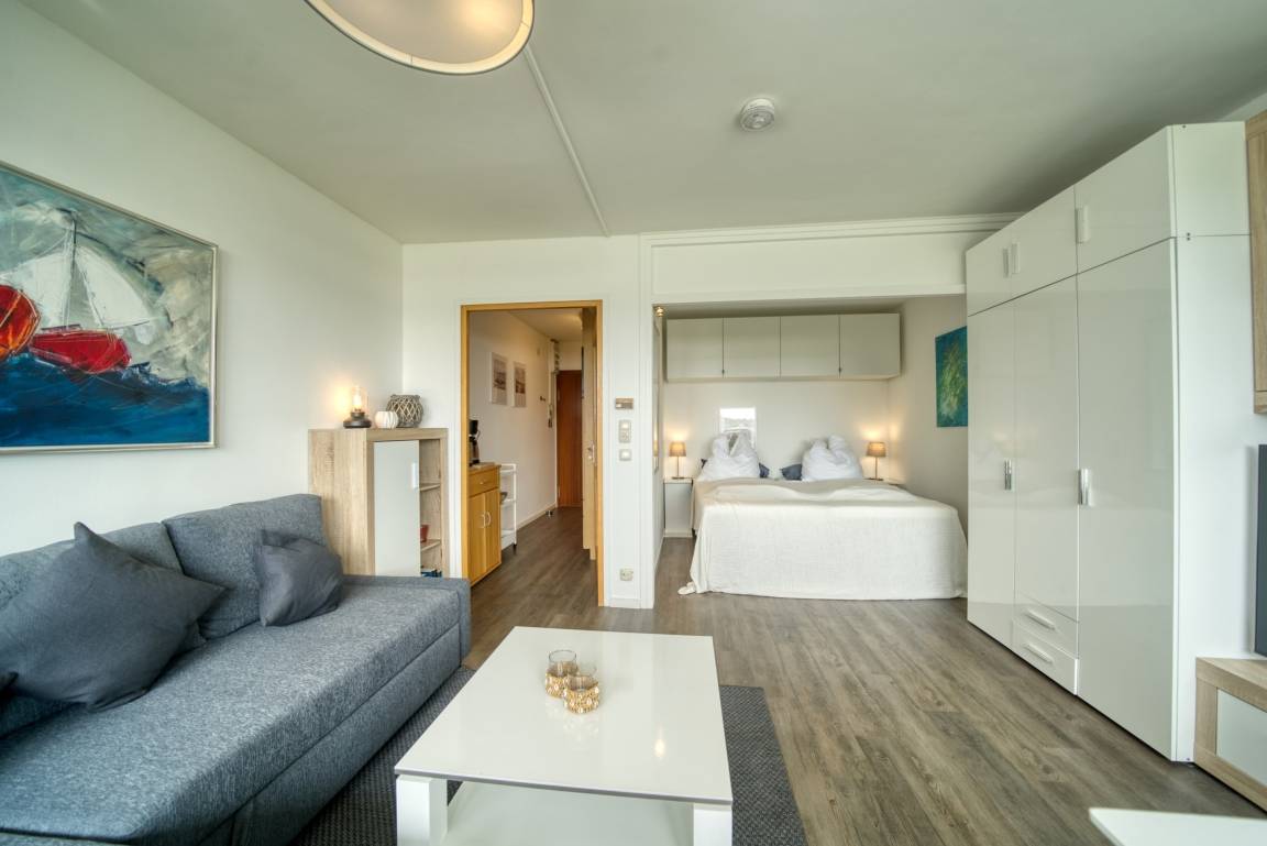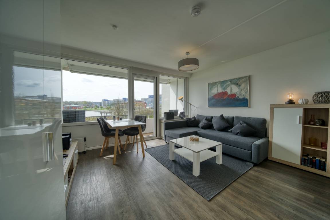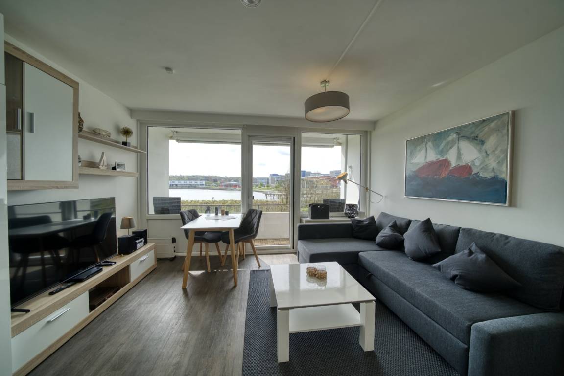 Wohn-/Schlafbereich mit Couch, Doppelbett und Kabel-Flat-TV. Küchenzeile mit allen wichtigen Geräten. Modernes Duschbad. Balkon mit Sonnenmarkise. Nichtraucherwohnung, keine Haustiere. Eigener Pkw-Stellplatz und gemeinschaftlicher Fahrradkeller im Haus. Strand nur ca. 10 m entfernt, Ferienpark mit Läden, Restaurants und Freizeiteinrichtungen ca. 5 Gehminuten. Ideal für entspannte Tage am Binnensee.