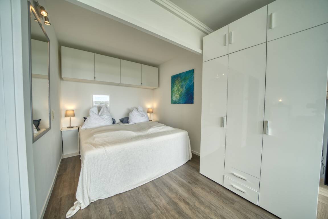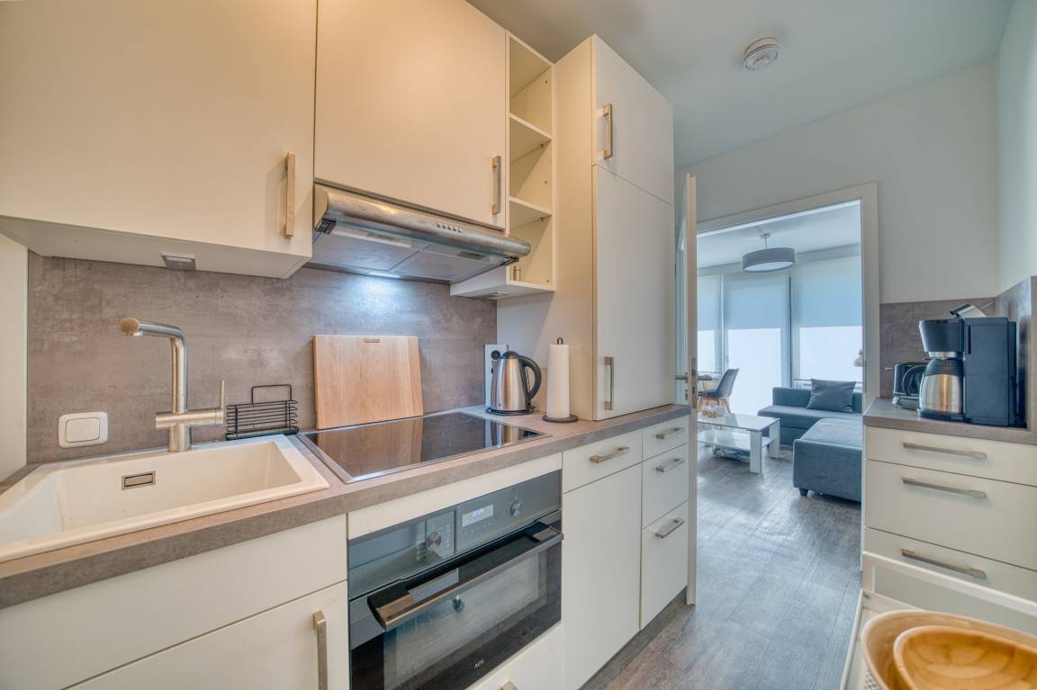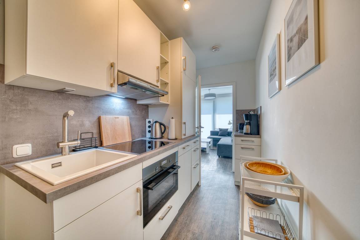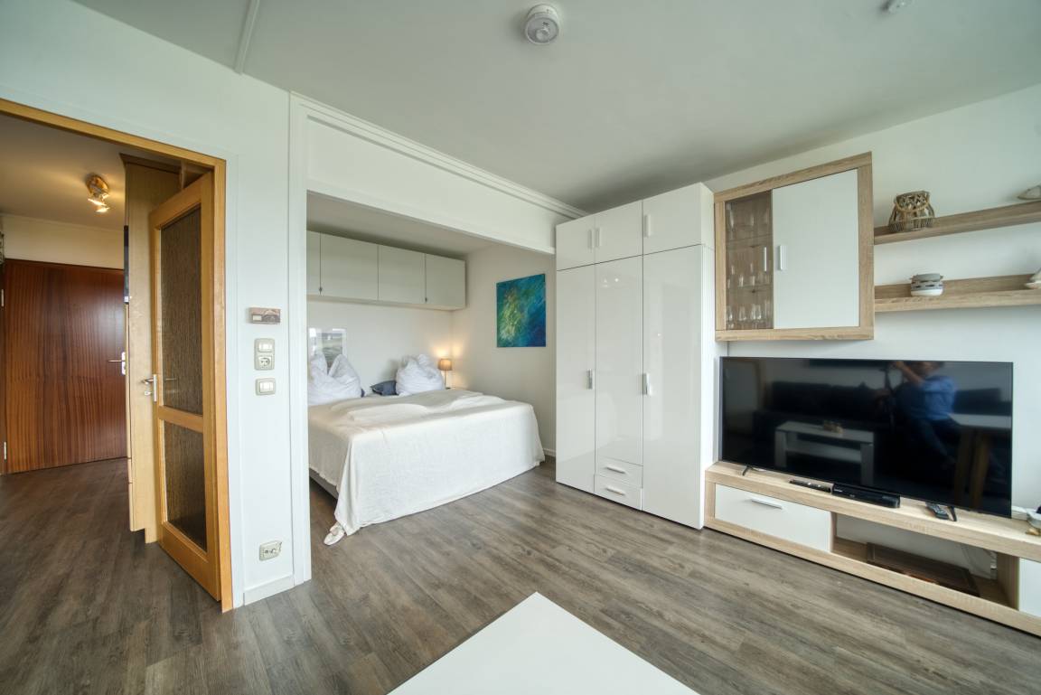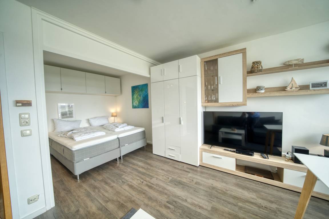 Wohn-/Schlafbereich mit Couch, Doppelbett und Kabel-Flat-TV. Küchenzeile mit allen wichtigen Geräten. Modernes Duschbad. Balkon mit Sonnenmarkise. Nichtraucherwohnung, keine Haustiere. Eigener Pkw-Stellplatz und gemeinschaftlicher Fahrradkeller im Haus. Strand nur ca. 10 m entfernt, Ferienpark mit Läden, Restaurants und Freizeiteinrichtungen ca. 5 Gehminuten. Ideal für entspannte Tage am Binnensee.