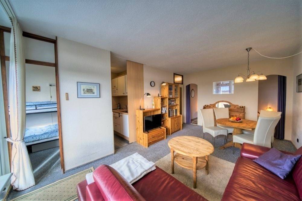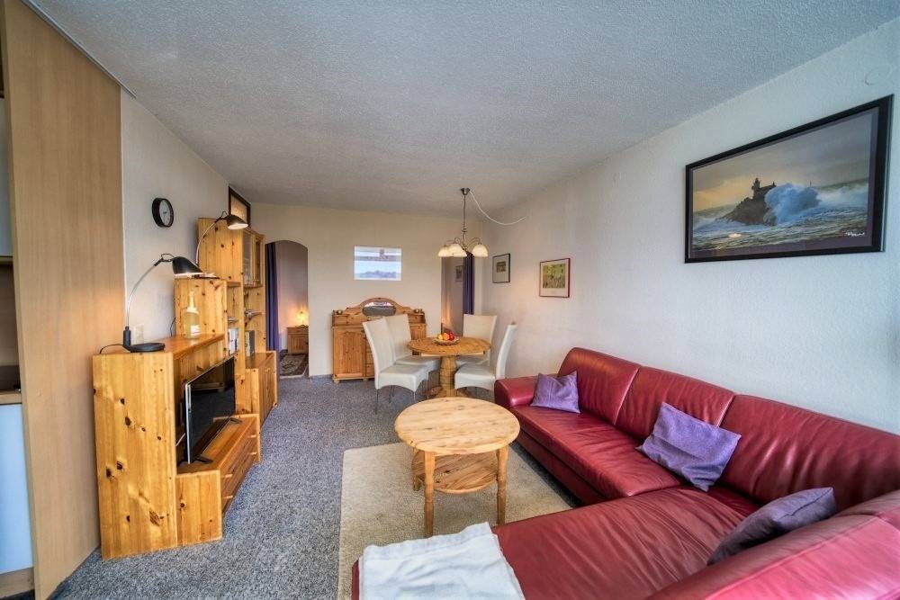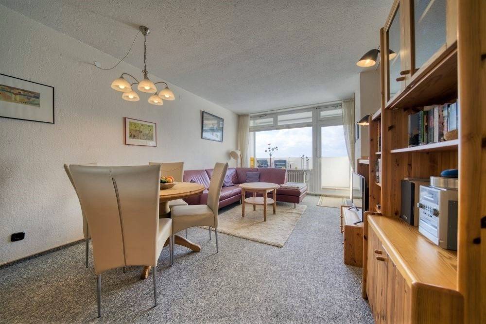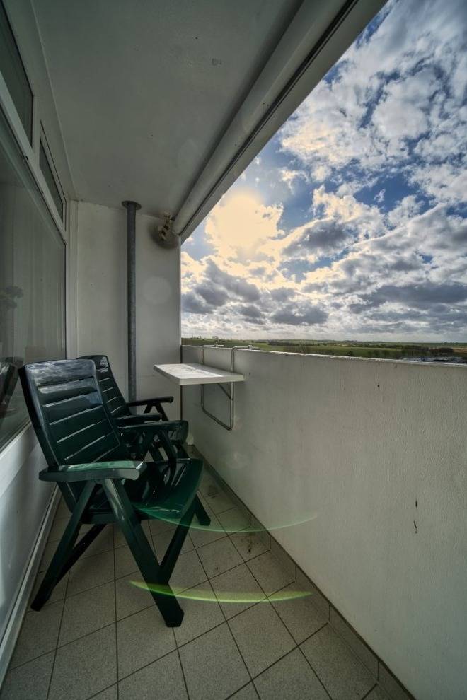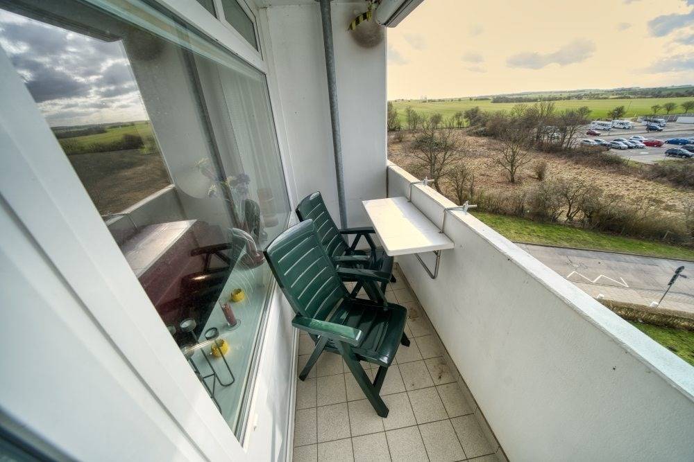 Helle Ferienwohnung in Haus M, 4. Etage, mit Balkon zur Südwestseite und Blick auf die Ostsee. Wohn-Esszimmer, Elternschlafbereich mit Doppelbett, Kinderzimmer mit Etagenbett und Verdunklung. Küche mit 4-Plattenherd, Mikrowelle und Kühlschrank. Bad mit Dusche und WC. TV und Radio im Wohnzimmer, Balkon mit Jalousie. Max. 3 Personen, Nichtraucher, keine Haustiere, kein WLAN. Fahrstuhl vorhanden, kostenfreier Parkplatz, Strand ca. 300 m. Hinweis: Wohnung nicht zeitgemäß eingerichtet. Ferienpark mit Aktiv-Hus, Schwimmbad, Sauna, Wellness und vielfältigen Freizeitmöglichkeiten.