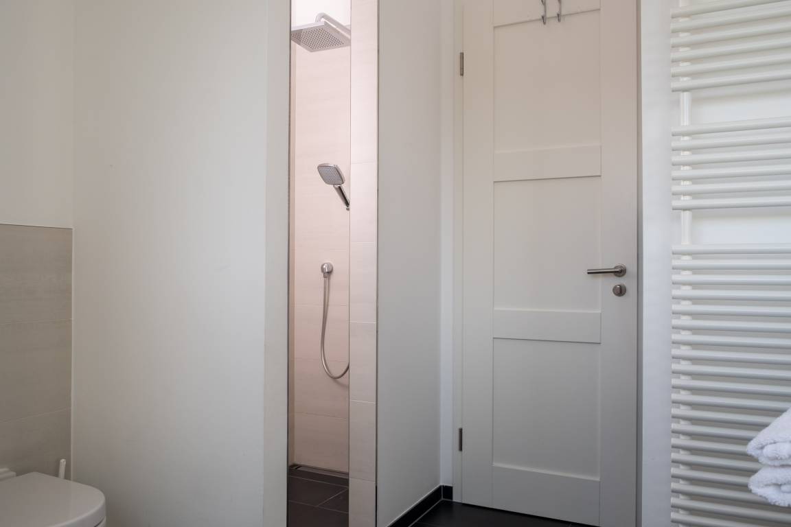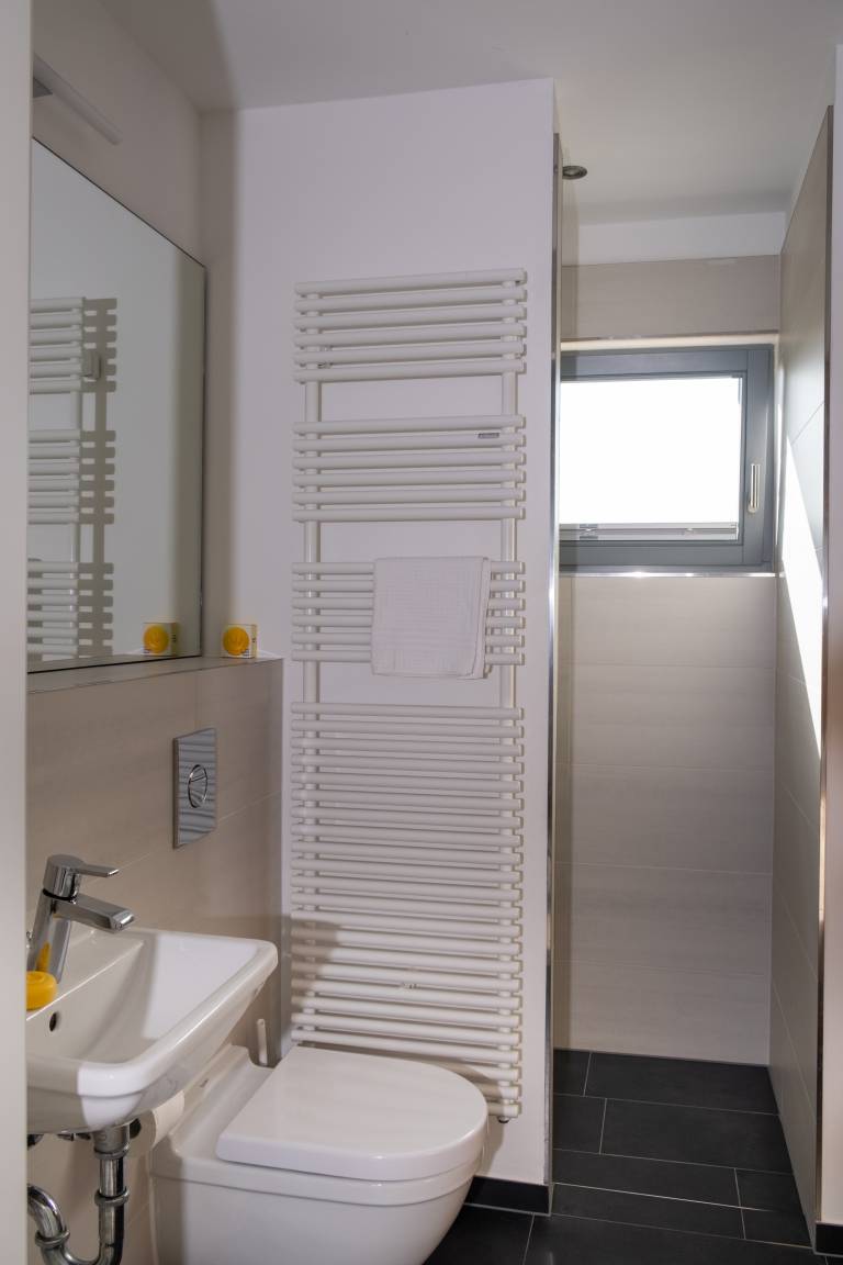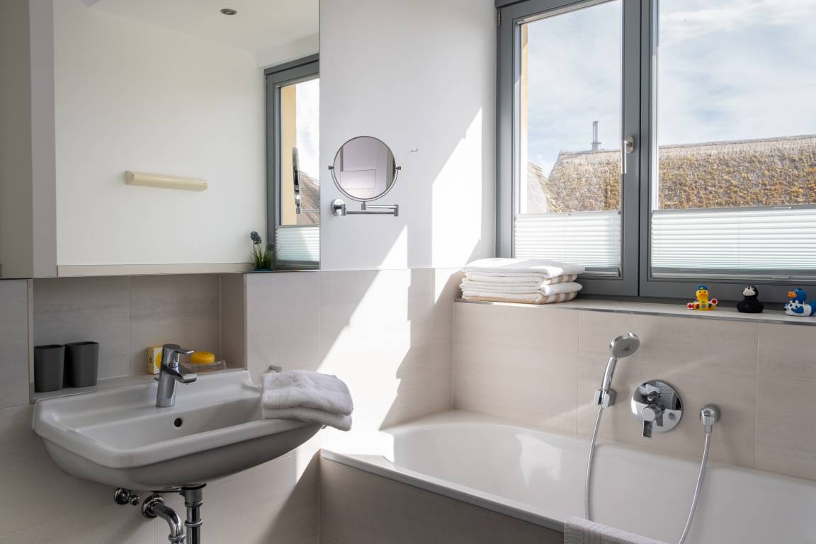Das obere Bad verfügt über Dusche und Badewanne sowie über einen Waschtrockner.