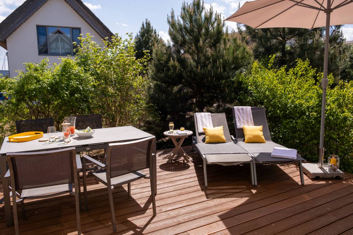 Das Sofa lässt sich einfach und schnell in ein Doppelbett (140x190) verwandeln. In der kalten Jahreszeit sorgt ein Kamin für Wärme und Gemütlichkeit, in den warmen Monaten bietet die große Holzterrasse mit hochwertigen Gartenmöbeln und Weber-Grill viel Platz für das Leben an der frischen Ostseeluft.