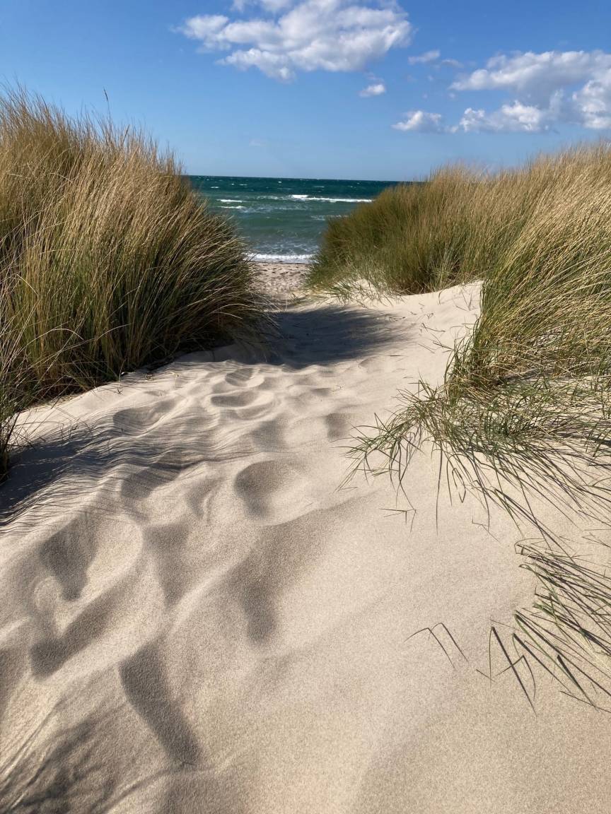 Der Blick fällt auf den Binnensee, den Yachthafen oder zum Teil auf die Ostsee.