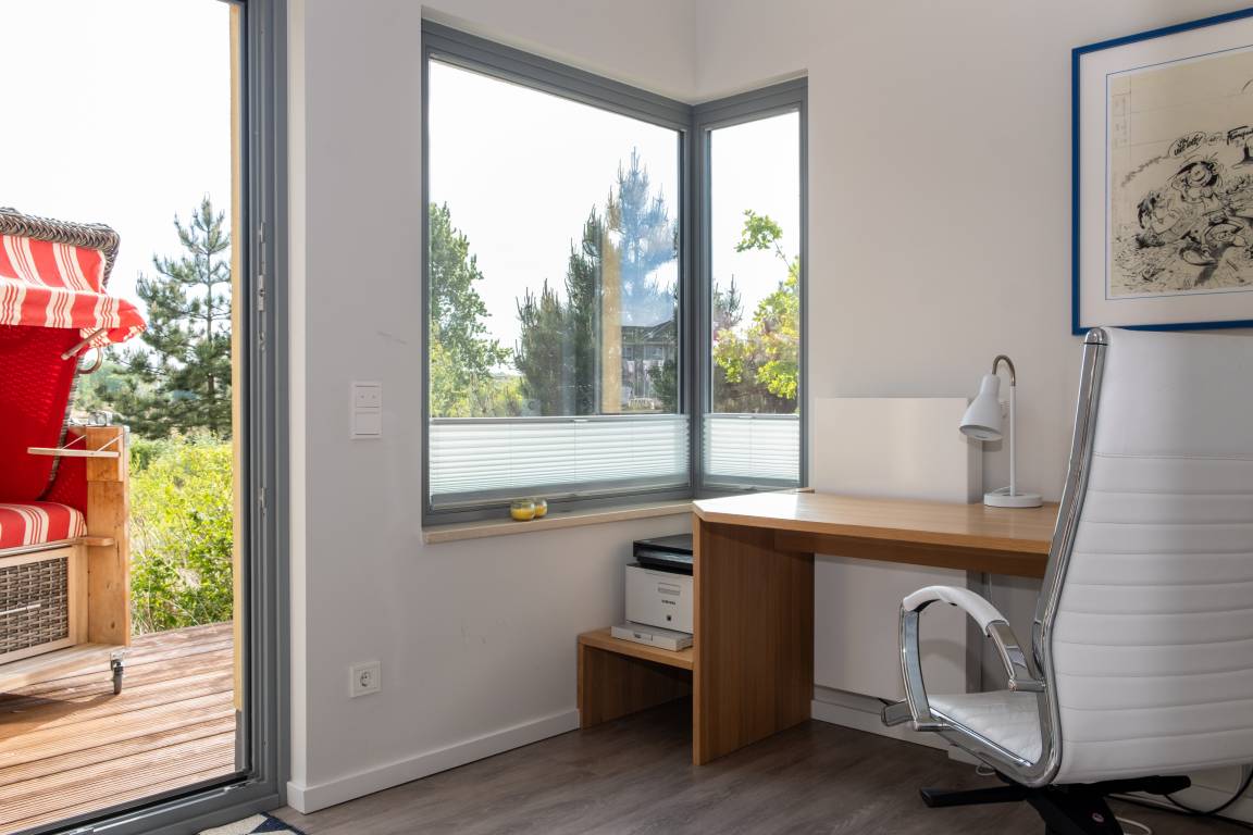 Im Parterre befindet sich ein gemütliches Arbeitszimmer mit Blick auf den Binnensee. Es ist mit einem großem Schreibtisch, einem Drucker mit Scanner und einer kleinen Bibliothek zum Thema Meer ausgestattet.