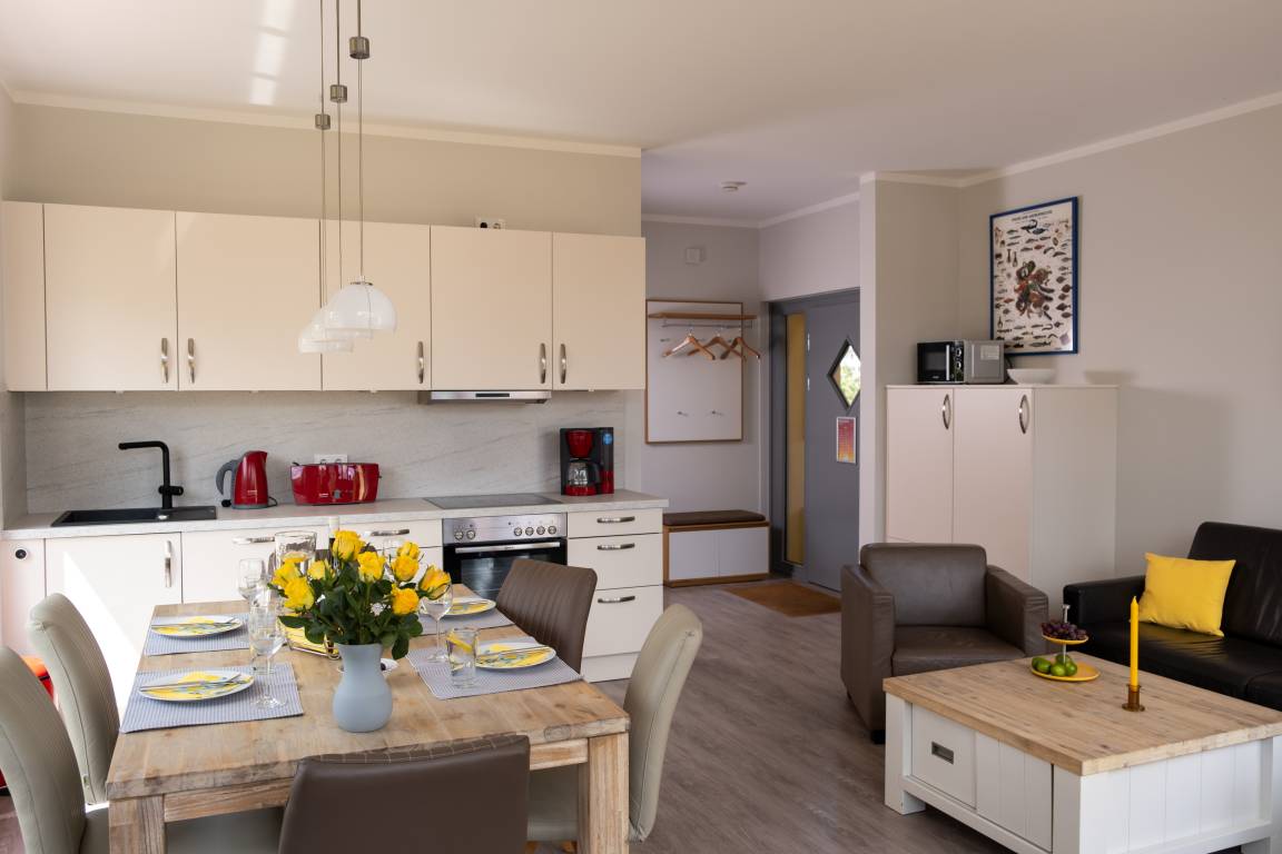 Den größten Raum der unteren Etage nimmt der modern eingerichtete Wohnbereich mit Küchenzeile ein. Ein großer Fernseher und Bluray-Player sind ebenso vorhanden wie Wasserkocher, Toaster, Kaffeemaschine, Nespressomaschine und ein elektrischer Handmixer sowie eine Mikrowelle.