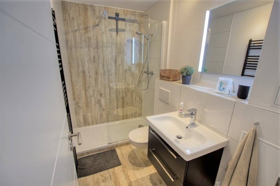 Der kombinierte Wohn- und Essbereich ist mit einem Doppelbett ausgestattet. Die offene Wohnküche verfügt u.a. über Backofen, Geschirrspüler, Kühlschrank mit Gefrierfach sowie Kapselkaffeemaschine. Das Badezimmer bietet einen niedrigen Duscheinstieg, Fußbodenheizung und Handtuchtrockner. WLAN ist kostenfrei verfügbar, ein Parkplatz gehört zur Wohnung. Münzwaschmaschine und Trockner stehen im Keller gegen Gebühr zur Verfügung.