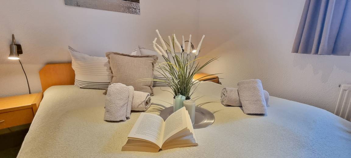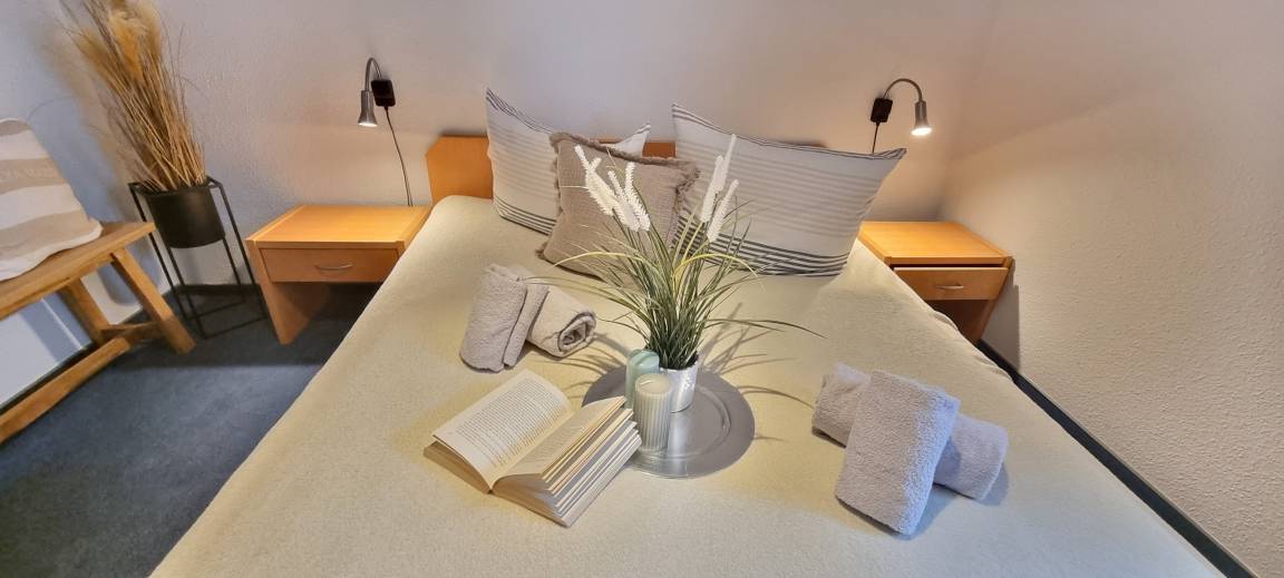 Die Wohnung verfügt über ein separates Schlafzimmer mit Doppelbett sowie einen wohnlich-gemütlichen Wohnbereich mit komfortablem Schlafsofa (Liegefläche 1,60 x 2,00 m) – ideal für bis zu 4 Personen. Eine praktische Küche, ein modernes Duschbad mit bodentiefer Glasdusche und ein eigener PKW-Stellplatz direkt vor dem Haus runden das Wohlfühlpaket ab.