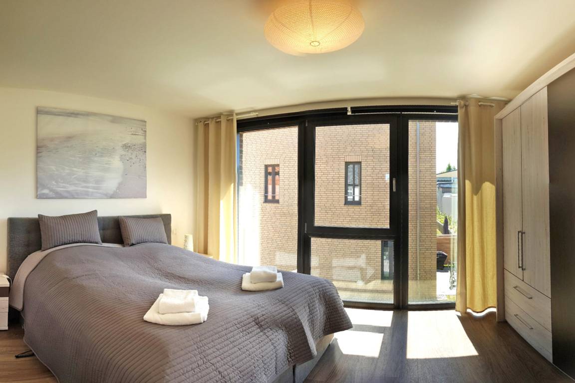 Die Schlafräume sind so gestaltet, dass sie Komfort bieten. Im ersten Obergeschoss erwartet Sie ein gemütliches Schlafzimmer mit einem Doppel-Boxspringbett. Das Dachgeschoss verfügt über ein weiteres Schlafzimmer mit Doppel-Boxspringbett sowie ein zusätzliches Zimmer mit zwei einzelnen Boxspringbetten. Besonders praktisch: Alle Betten sind elektrisch verstellbar und ermöglichen somit eine individuelle Liegeposition für erholsamen Schlaf. Für Kleinkinder stehen Babyreisebetten (gegen Gebühr) sowie ein Hochstuhl bereit. Bodentiefe Fensterfronten sorgen für eine freundliche und helle Atmosphäre, während Verdunklungsvorhänge und Rollos für erholsame Nächte und Privatsphäre sorgen.