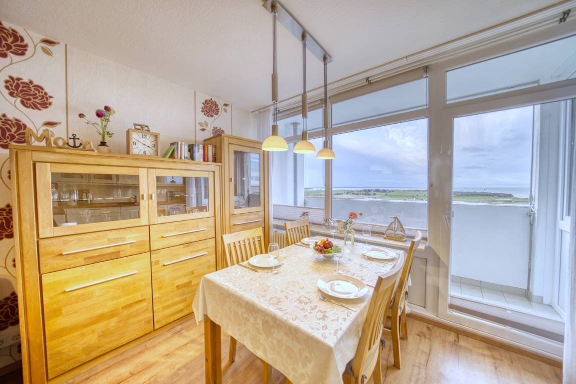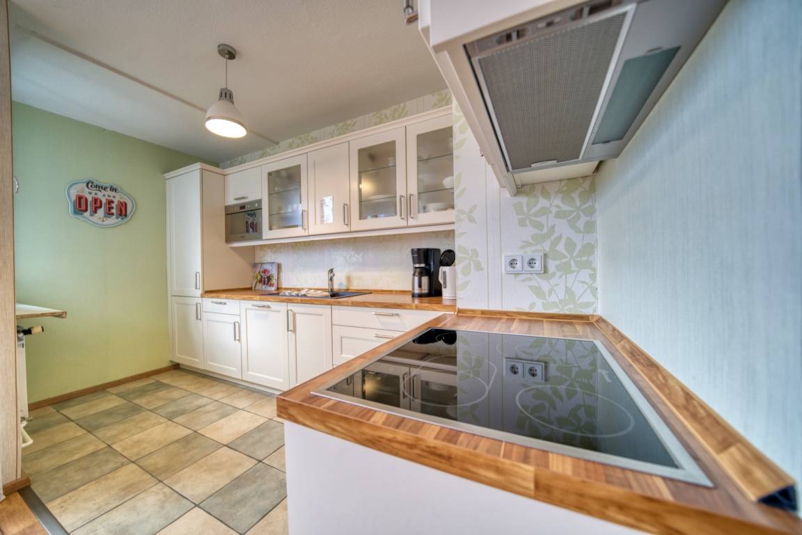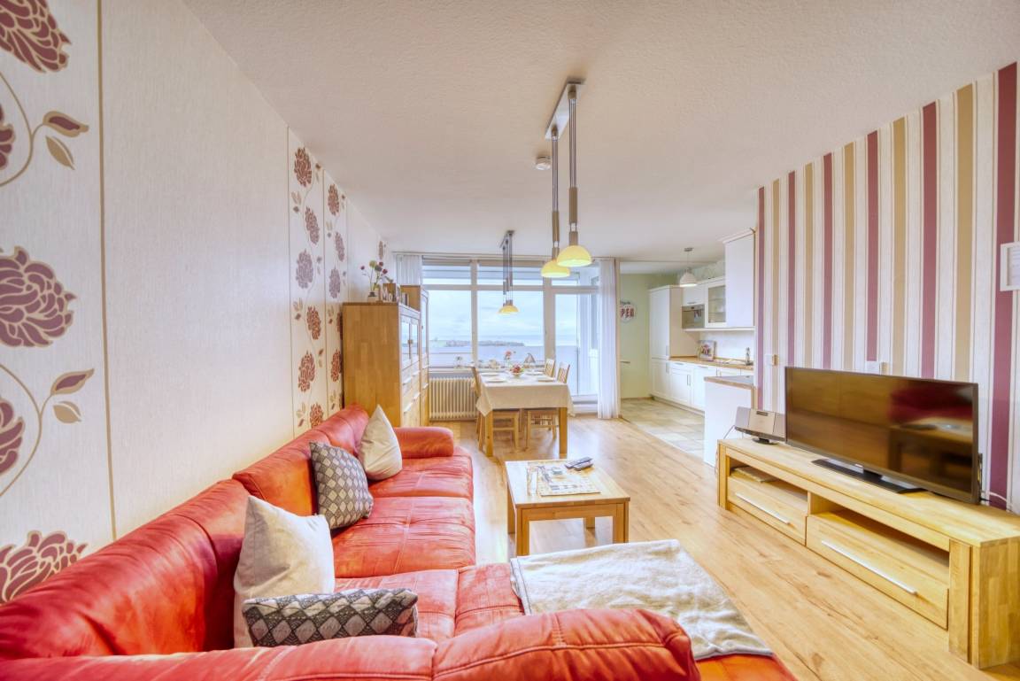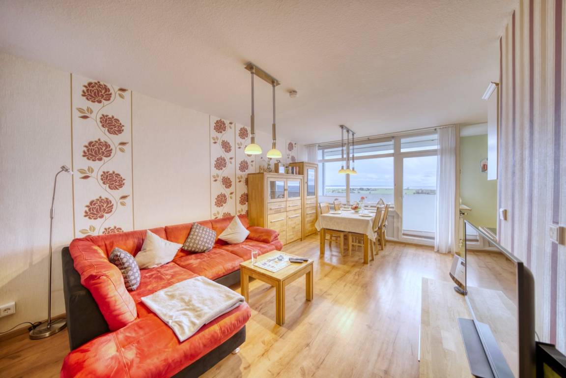 Wohnfläche 45 qm. Wohn-/Esszimmer mit Schlafcouch (2,45 m × 1,80 m), Elternschlafraum mit Doppelbett. Moderne Küche mit Kaffeemaschine, Wasserkocher, Toaster, Kühlschrank mit Gefrierfach, 4-Platten-Herd und Backofen. Bad mit WC und Duschkabine. Radio [&] TV im Wohnzimmer. Bonus: WLAN, kostenloser Strandkorb (Mitte Mai–Mitte September). Nichtraucher, keine Haustiere, max. 4 Personen, Fahrstuhl, Fahrradräume, Strand ca. 300 m, Parkplatz kostenlos. Ferienpark mit Schwimmbad, Sauna, Wellness, Läden und Kinderspielwelt.