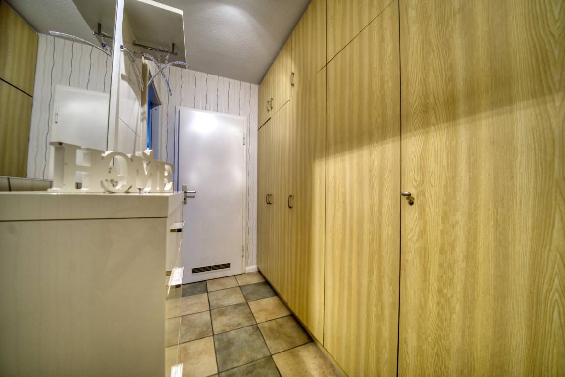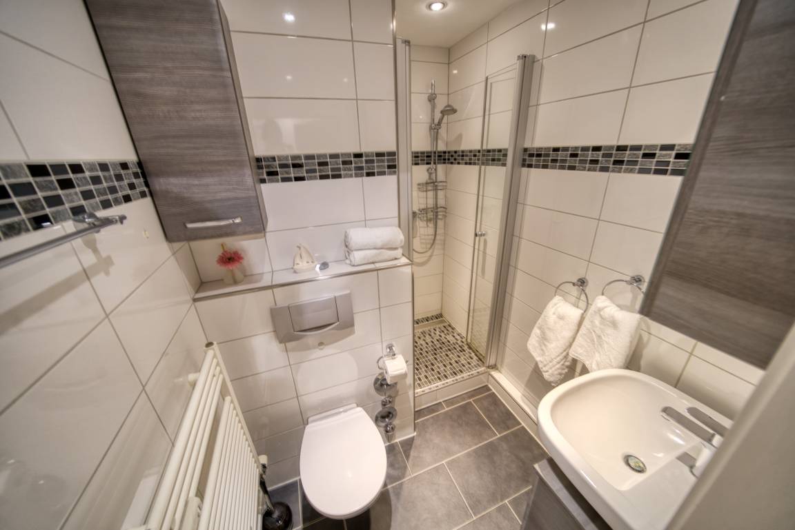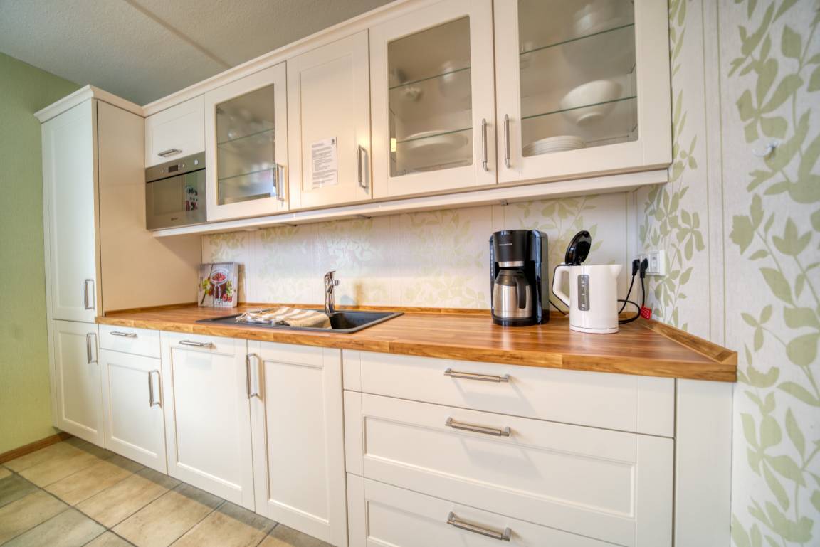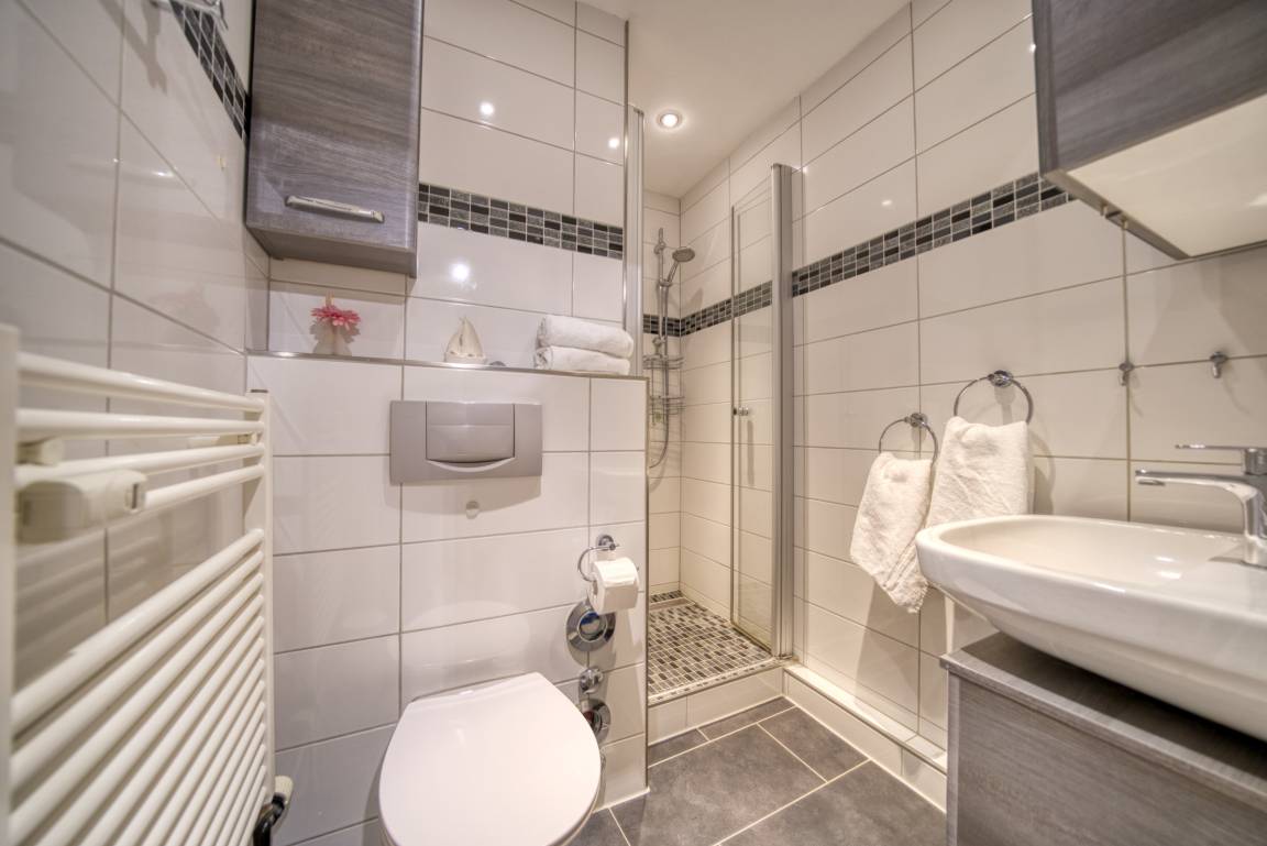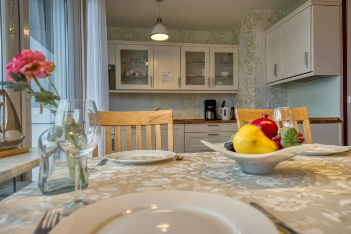 Wohnfläche 45 qm. Wohn-/Esszimmer mit Schlafcouch (2,45 m × 1,80 m), Elternschlafraum mit Doppelbett. Moderne Küche mit Kaffeemaschine, Wasserkocher, Toaster, Kühlschrank mit Gefrierfach, 4-Platten-Herd und Backofen. Bad mit WC und Duschkabine. Radio [&] TV im Wohnzimmer. Bonus: WLAN, kostenloser Strandkorb (Mitte Mai–Mitte September). Nichtraucher, keine Haustiere, max. 4 Personen, Fahrstuhl, Fahrradräume, Strand ca. 300 m, Parkplatz kostenlos. Ferienpark mit Schwimmbad, Sauna, Wellness, Läden und Kinderspielwelt.