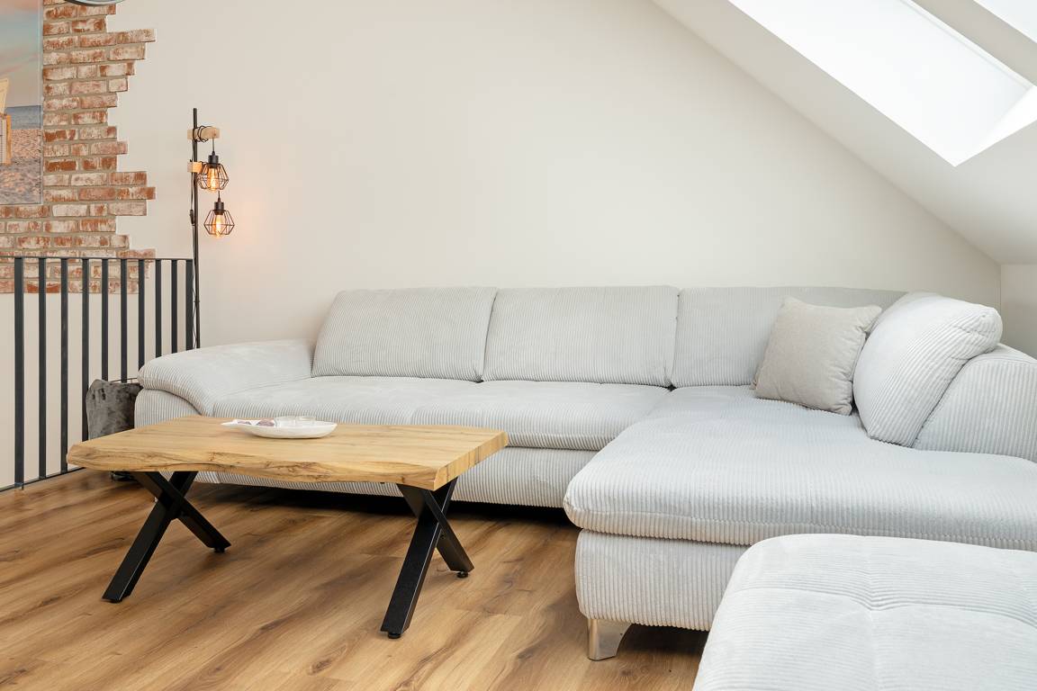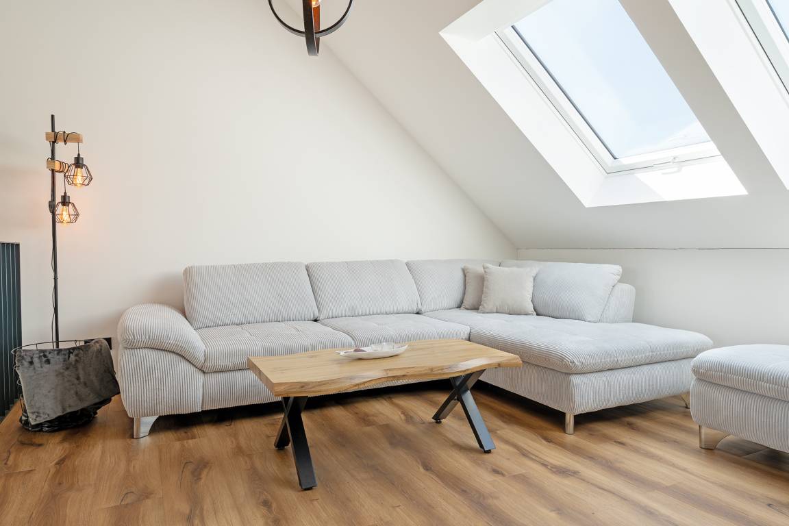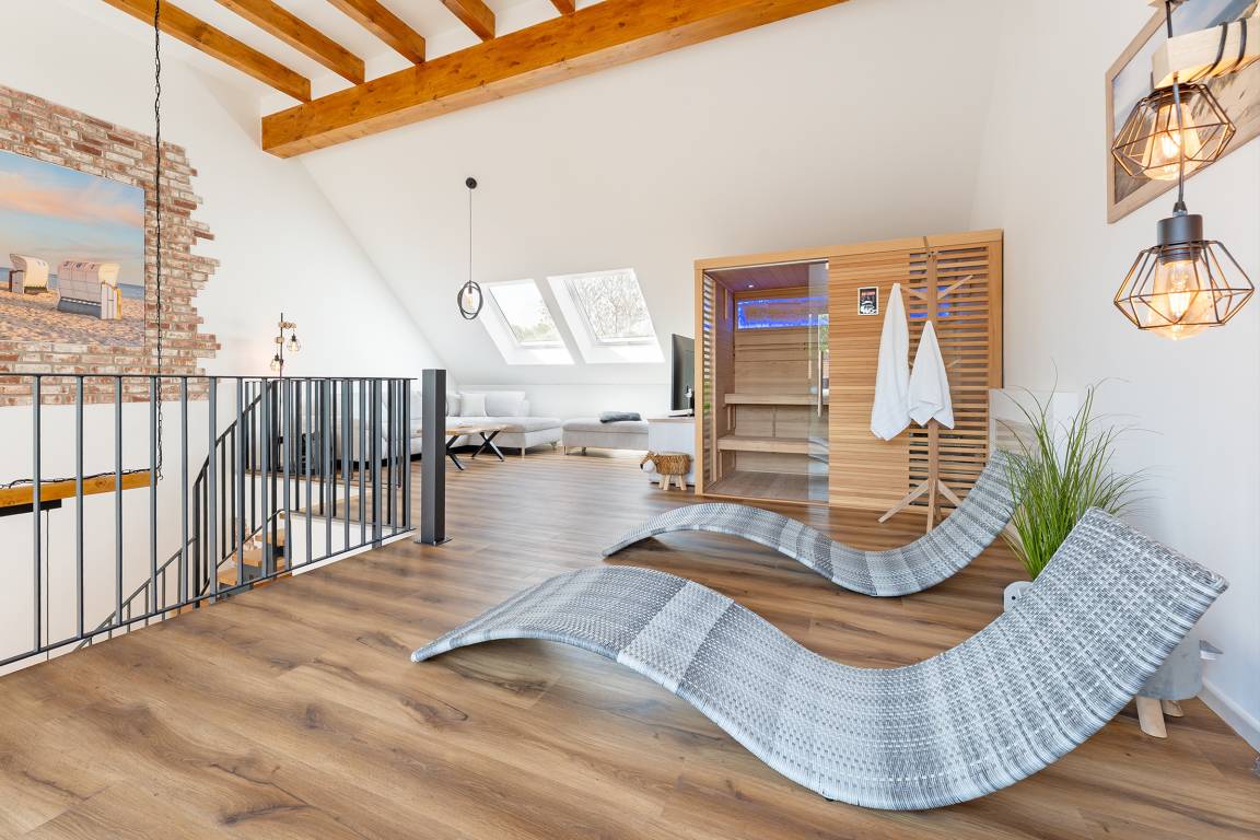 Das Herzstück der Wohnung bildet der gemütliche Wohnbereich mit Sofa, TV und direktem Zugang zur Dachterrasse. Die großen Fenster lassen viel Licht herein und bieten eine tolle Aussicht. Ein besonderes Highlight ist die Sauna im Wohnbereich. Die Terrasse ist mit Gartenmöbeln und einem Gasgrill versehen – perfekt für entspannte Grillabende. Die offene Küche ist mit einem Induktionsherd, Backofen, Spülmaschine, Kaffeevollautomat, Mikrowelle und weiteren modernen Geräten ausgestattet. Der große Esstisch lädt zum gemeinsamen Essen und geselligen Abenden ein. Zwei Schlafzimmer und das Wohnzimmer bieten Platz für bis zu 6 Personen. Ein Zimmer ist mit einem Doppelbett (180x200 cm) ausgestattet, während das zweite über zwei Einzelbetten (je 90x200 cm) verfügt. Im Wohnzimmer erwartet Sie ein großzügiges Schlafsofa (250x200 cm). Zwei Babybetten und zwei Kinderhochstühle stehen ebenfalls bereit. Das Badezimmer ist modern ausgestattet und verfügt über eine bodengleiche Dusche mit Haltegriff, eine Badewanne, ein Waschbecken und ein WC. Eine Waschmaschine und ein Trockner stehen Ihnen zur Verfügung.