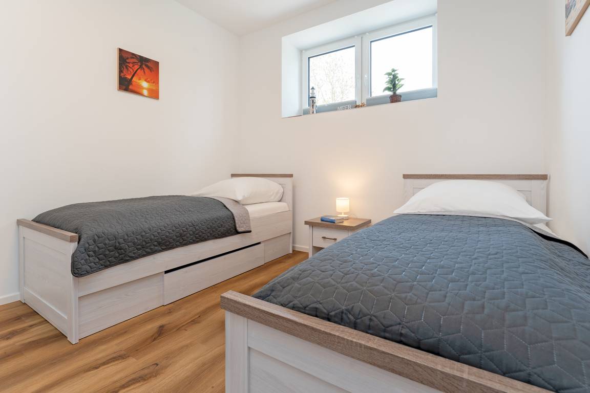 Schlafzimmer 2: 2 Einzelbetten (2x 90x200 cm), Kleiderschrank, Verdunkelung: Verdunkelungsplissees und -vorhänge, Platz für ein Babybett vorhanden