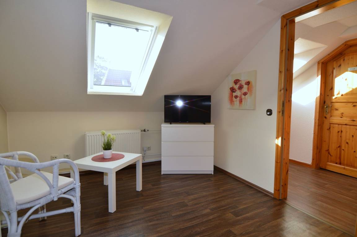 Im Dachgeschoss steht ein weiteres Schlafzimmer zur Verfügung, ausgestattet mit Einzelbett, Gitterbett und TV. Damit ist die Wohnung besonders gut für Gäste mit Kind geeignet.