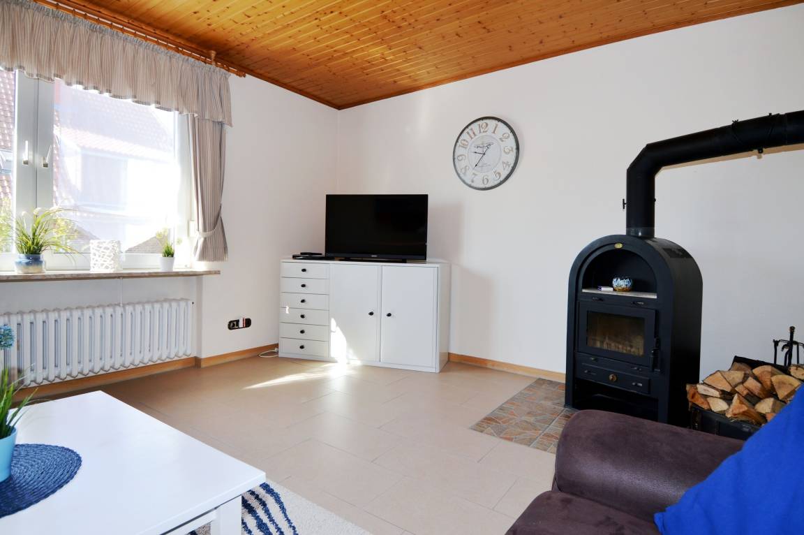 Herzstück der Wohnung ist der einladende Wohnbereich im 1. Obergeschoss. Hier kann auf der gemütlichen Couch entspannt oder der Abend vor dem Kaminofen ausgeklingt werden, der besonders an kühleren Tagen für eine behagliche Atmosphäre sorgt. Mit dem WLAN bleiben Sie auch im Urlaub bequem online oder genießen Ihre Lieblingsserien und Filme.