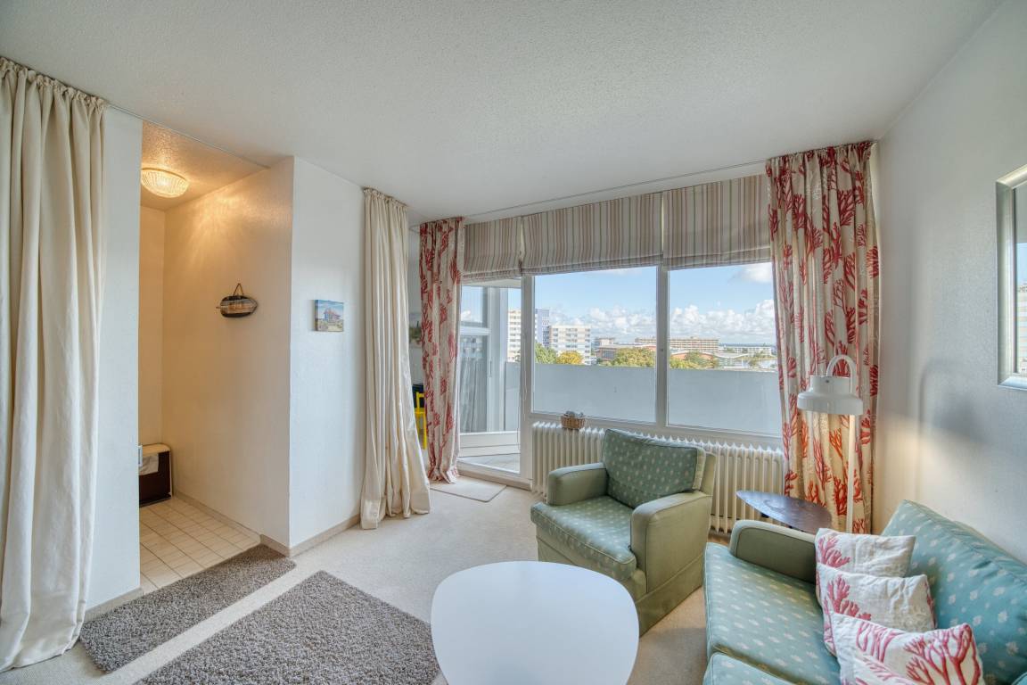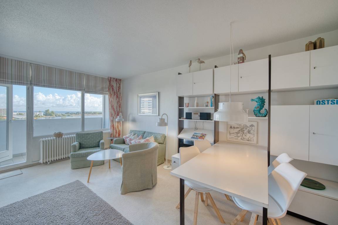 Wohnfläche ca. 45 m². Wohn-Esszimmer, Elternschlafraum mit Einzelbetten, Kinderzimmer mit Etagenbett. Küche mit Kühlschrank und 4-Plattenherd. Badezimmer mit WC und Dusche. Fernseher im Wohnzimmer. WLAN inklusive. Nichtraucher, keine Haustiere, max. 4 Personen, Fahrstuhl, kostenfreier PKW-Stellplatz. Ferienpark bietet Shops, Aktiv-Hus mit Schwimmbad, Sauna, Wellness und Kinderspielwelt. Strand ca. 300 m, fußläufig über Promenade erreichbar.