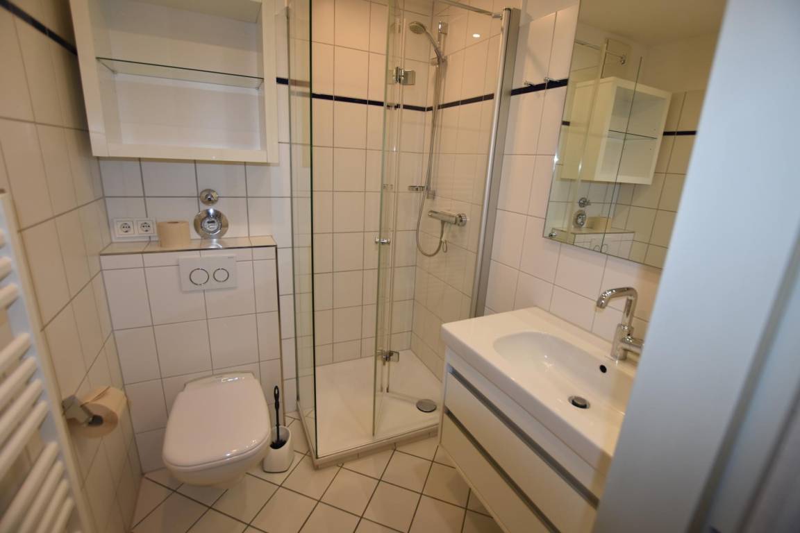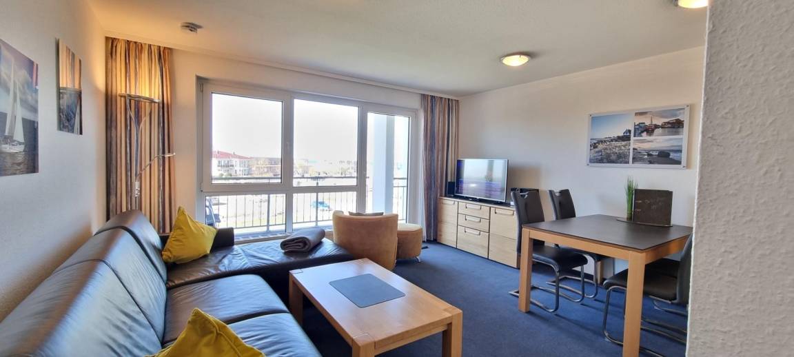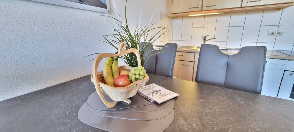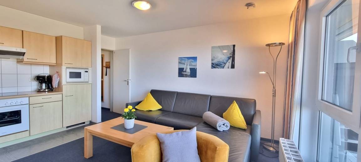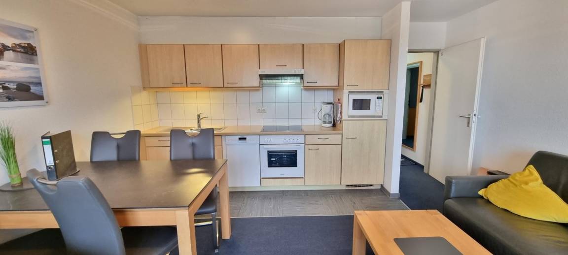 Die kombinierte Küchenzeile ist vollständig ausgestattet und ermöglicht eine unkomplizierte Selbstversorgung – von Frühstück über Snacks bis hin zu einem entspannten Abendessen in Ihrem Appartement. Genießen Sie Ihre Mahlzeiten im Wohnbereich oder lassen Sie die frische Meeresluft auf dem möblierten Westbalkon wirken. Dieser Balkon ist besonders reizvoll: hier können Sie die Abendsonne genießen, bei einem Glas Wein entspannen und die ruhige Atmosphäre sowie den schönen Ausblick über die Umgebung auf sich wirken lassen.